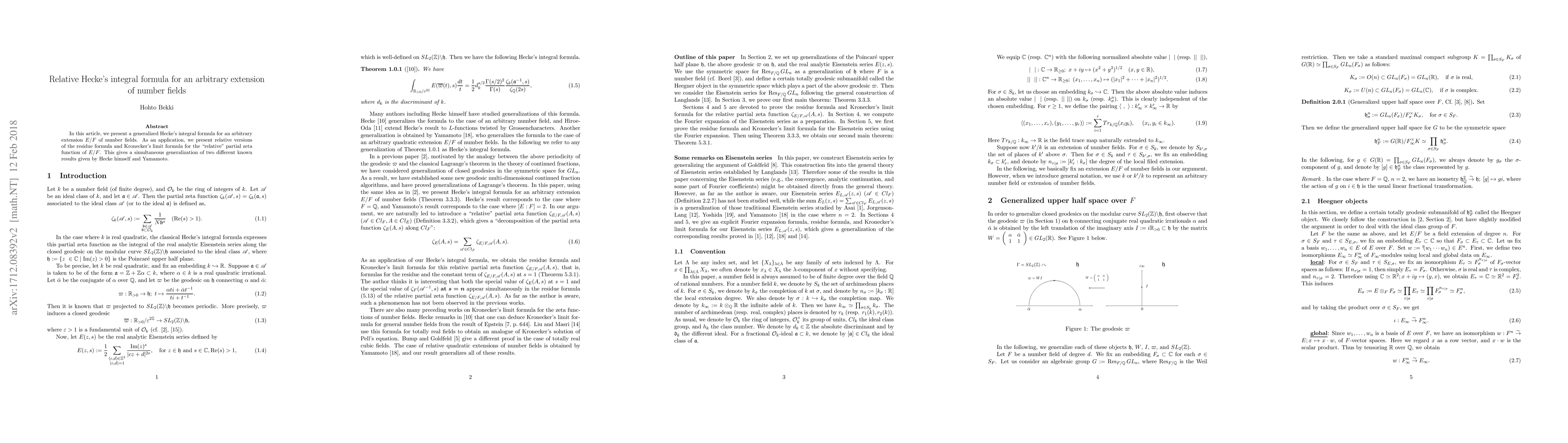 This paper generalizes Hecke's integral formula for number field extensions, presenting relative versions of residue and Kronecker's limit formulas for the relative partial zeta function, thereby extending results by Hecke and Yamamoto.