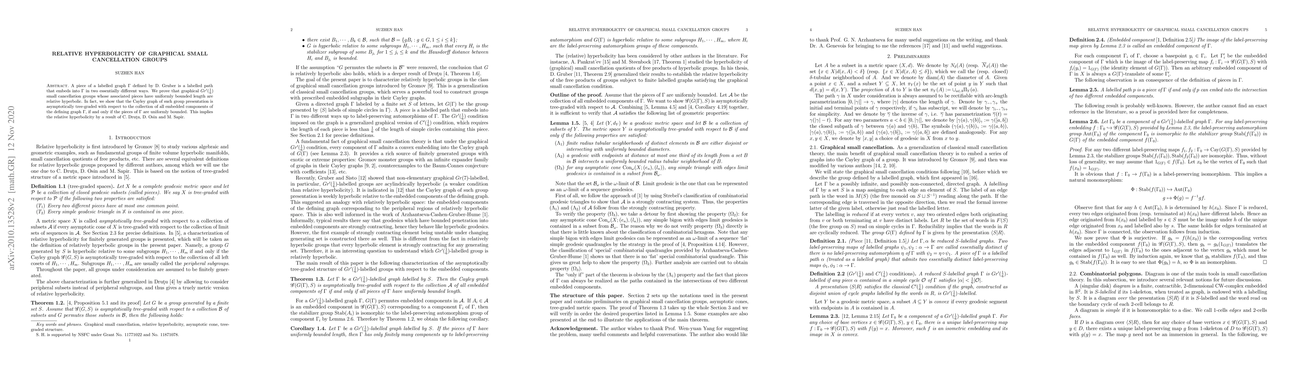 A piece of a labelled graph $\Gamma$ defined by D. Gruber is a labelled path that embeds into $\Gamma$ in two essentially different ways. We prove that graphical $Gr'(\frac{1}{6})$ small cancellation groups whose associated pieces have uniformly bounded length are relative hyperbolic. In fact, we show that the Cayley graph of such group presentation is asymptotically tree-graded with respect to the collection of all embedded components of the defining graph $\Gamma$, if and only if the pieces of $\Gamma$ are uniformly bounded. This implies the relative hyperbolicity by a result of C. Dru\c{t}u, D. Osin and M. Sapir.
