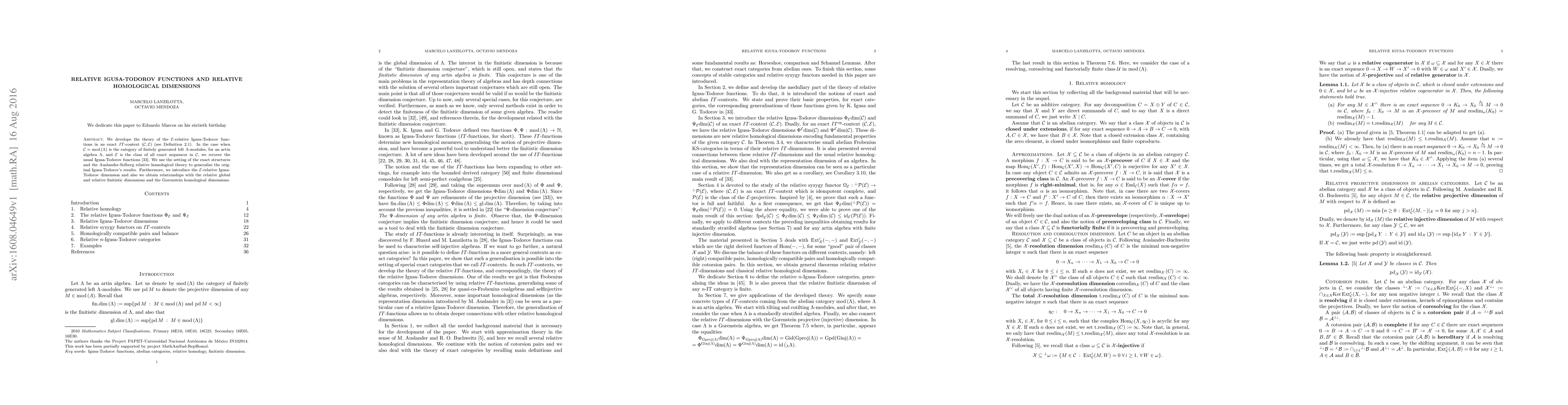 We develope the theory of the $\mathcal{E}$-relative Igusa-Todorov functions in an exact $ IT$-context $(\mathcal{C},\mathcal{E}).$ In the case when $\mathcal{C}=$mod$\, (\Lambda)$ is the category of finitely generated left $\Lambda$-modules, for an artin algebra $\Lambda,$ and $\mathcal{E}$ is the class of all exact sequences in $\mathcal{C},$ we recover the usual Igusa-Todorov functions. We use the setting of the exact structures and the Auslander-Solberg relative homological theory to generalise the original Igusa-Todorov's results. Furthermore, we introduce the $\mathcal{E}$-relative Igusa-Todorov dimension and also we obtain relationships with the relative global and relative finitistic dimensions and the Gorenstein homological dimensions.