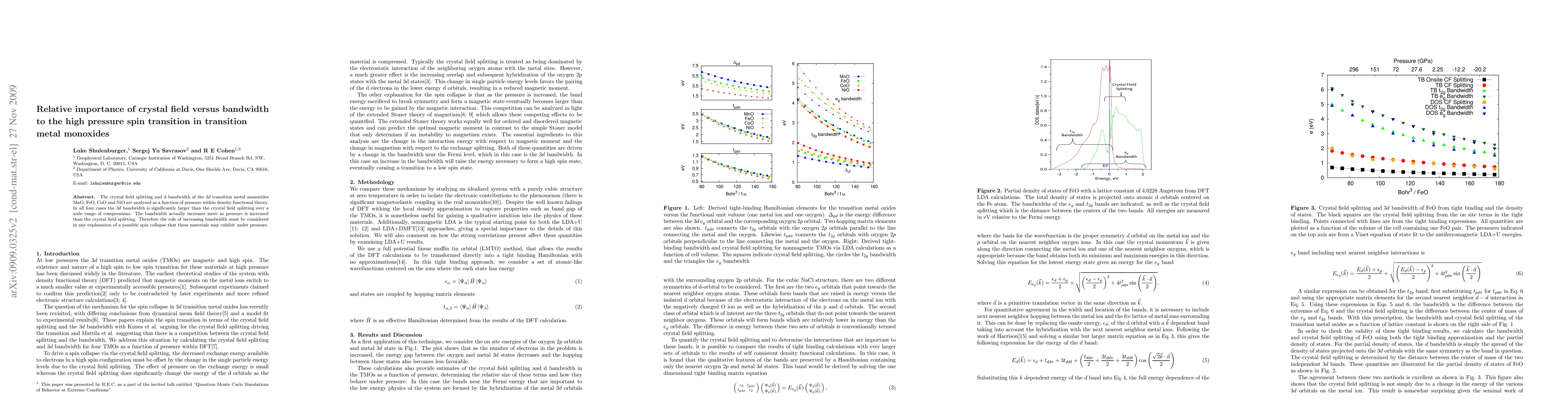 The crystal field splitting and d bandwidth of the 3d transition metal monoxides MnO, FeO, CoO and NiO are analyzed as a function of pressure within density functional theory. In all four cases the 3d bandwidth is significantly larger than the crystal field splitting over a wide range of compressions. The bandwidth actually increases more as pressure is increased than the crystal field splitting. Therefore the role of increasing bandwidth must be considered in any explanation of a possible spin collapse that these materials may exhibit under pressure.