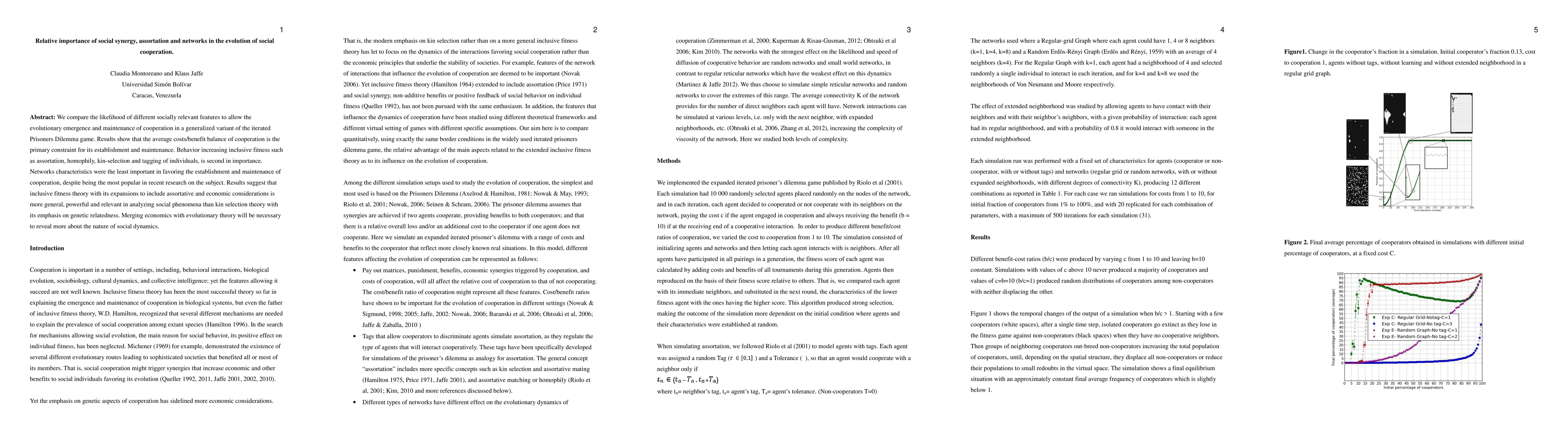 We compare the likelihood of different socially relevant features to allow the evolutionary emergence and maintenance of cooperation in a generalized variant of the iterated Prisoners Dilemma game. Results show that the average costs/benefit balance of cooperation is the primary constraint for its establishment and maintenance. Behavior increasing inclusive fitness such as assortation, homophily, kin-selection and tagging of individuals, is second in importance. Networks characteristics were the least important in favoring the establishment and maintenance of cooperation, despite being the most popular in recent research on the subject. Results suggest that inclusive fitness theory with its expansions to include assortative and economic considerations is more general, powerful and relevant in analyzing social phenomena than kin selection theory with its emphasis on genetic relatedness. Merging economics with evolutionary theory will be necessary to reveal more about the nature of social dynamics.