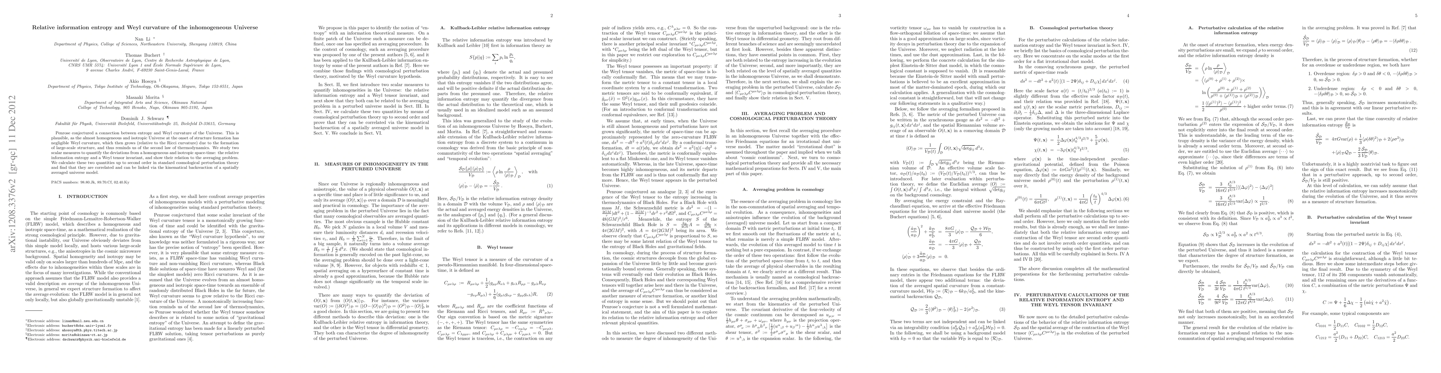 Penrose conjectured a connection between entropy and Weyl curvature of the Universe. This is plausible, as the almost homogeneous and isotropic Universe at the onset of structure formation has negligible Weyl curvature, which then grows (relative to the Ricci curvature) due to the formation of large-scale structure and thus reminds us of the second law of thermodynamics. We study two scalar measures to quantify the deviations from a homogeneous and isotropic space-time, the relative information entropy and a Weyl tensor invariant, and show their relation to the averaging problem. We calculate these two quantities up to second order in standard cosmological perturbation theory and find that they are correlated and can be linked via the kinematic backreaction of a spatially averaged universe model.