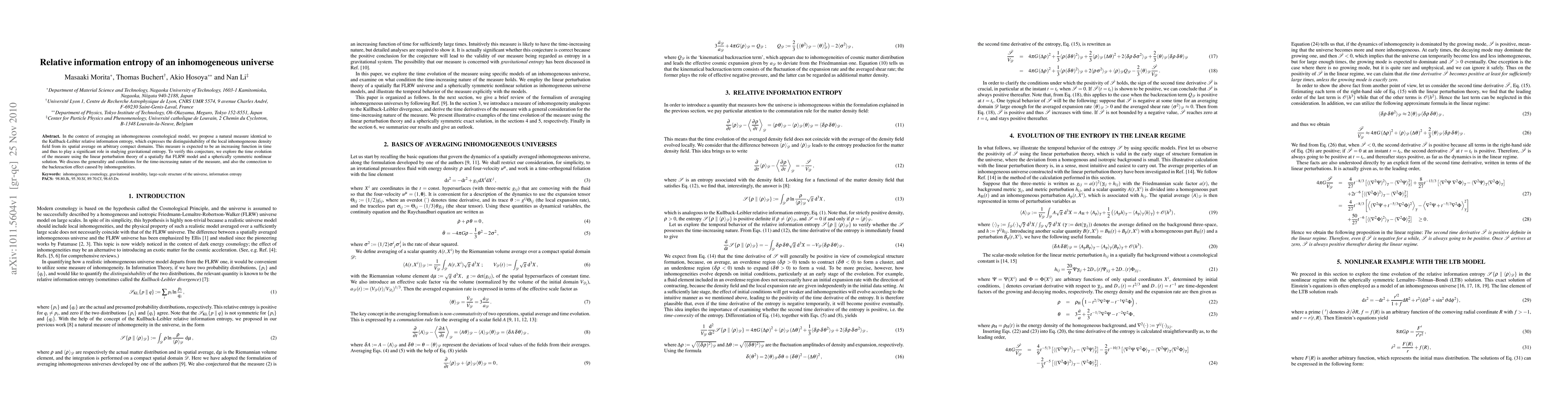 In the context of averaging an inhomogeneous cosmological model, we propose a natural measure identical to the Kullback-Leibler relative information entropy, which expresses the distinguishability of the local inhomogeneous density field from its spatial average on arbitrary compact domains. This measure is expected to be an increasing function in time and thus to play a significant role in studying gravitational entropy. To verify this conjecture, we explore the time evolution of the measure using the linear perturbation theory of a spatially flat FLRW model and a spherically symmetric nonlinear solution. We discuss the generality and conditions for the time-increasing nature of the measure, and also the connection to the backreaction effect caused by inhomogeneities.