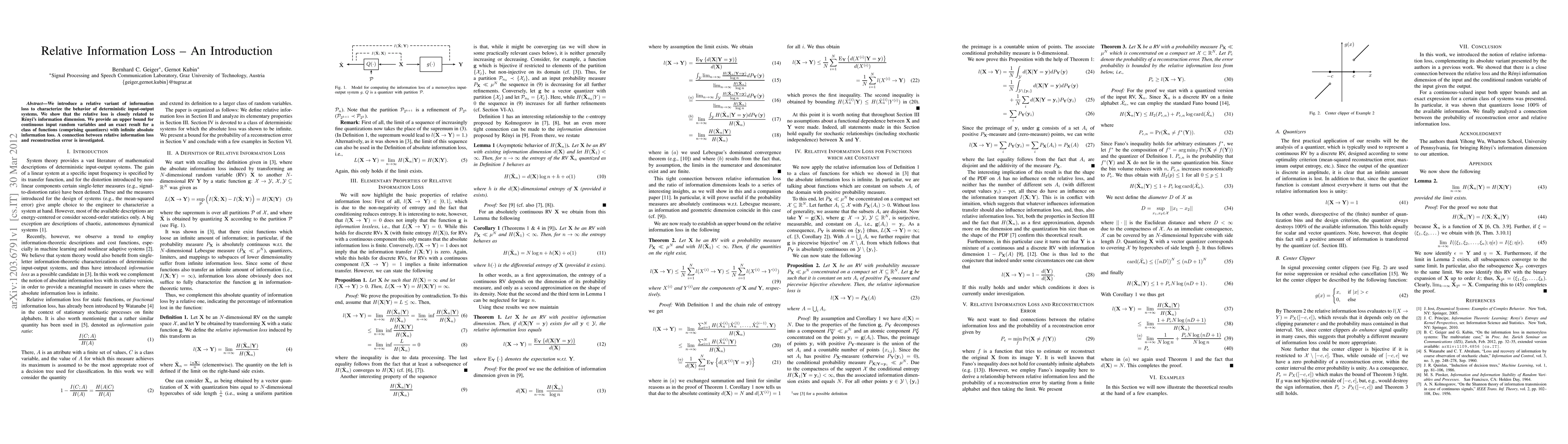 This paper introduces a relative variant of information loss to analyze deterministic systems, linking it to Renyi's information dimension. It provides an upper bound for continuous inputs and an exact result for quantizers, also exploring its connection to reconstruction error.