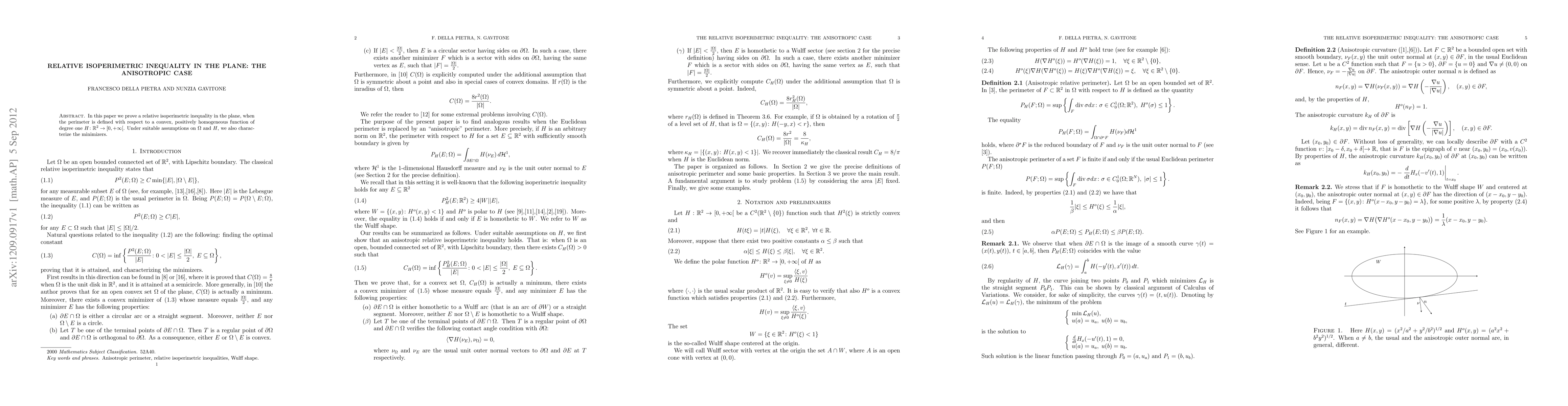 We prove a relative isoperimetric inequality in the plane, when the perimeter is defined with respect to a convex, positively homogeneous function of degree one, and characterize the minimizers.