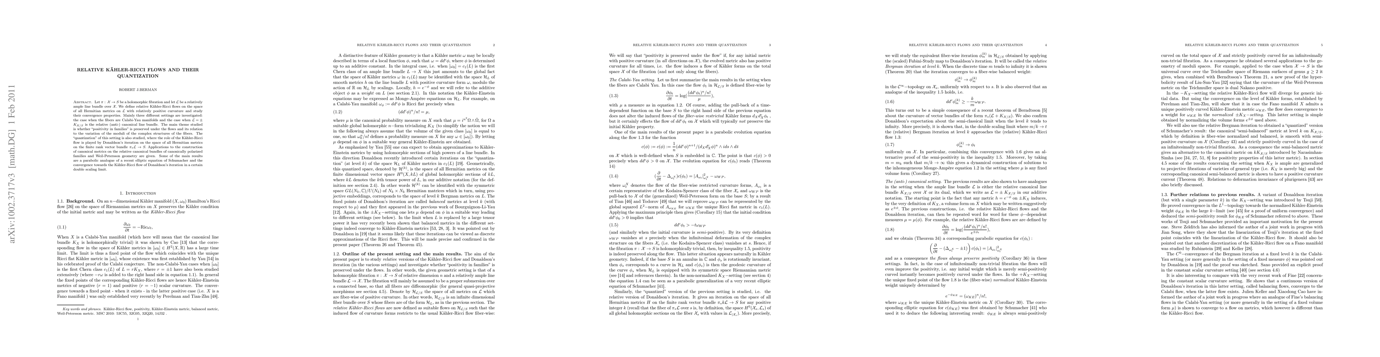 Let X be a complex manifold fibered over the base S and let L be a relatively ample line bundle over X. We define relative Kahler-Ricci flows on the space of all Hermitian metrics on L with relatively positive curvature. Mainly three different settings are investigated: the case when the fibers are Calabi-Yau manifolds and the case when L is the relative (anti-) canonical line bundle. The main theme studied is whether posivity in families is preserved under the flows and its relation to the variation of the moduli of the complex structures of the fibres. The quantization of this setting is also studied, where the role of the Kahler-Ricci flow is played by Donaldson's iteration on the space of all Hermitian metrics on the finite rank vector bundle over S defined as the zeroth direct image induced by the fibration. Applications to the construction of canonical metrics on relative canonical bumdles and Weil-Petersson geometry are given. Some of the main results are a parabolic analogue of a recent elliptic equation of Schumacher and the convergence towards the K\"ahler-Ricci flow of Donaldson's iteration in a certain double scaling limit.