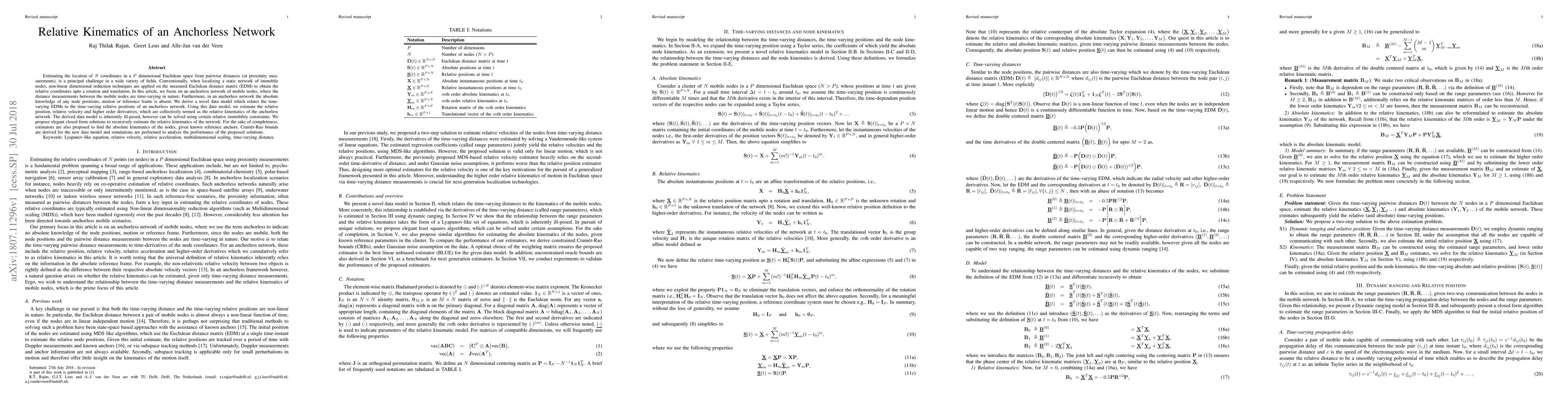 This paper develops a novel data model to estimate the relative kinematics of an anchorless network of mobile nodes, where distance measurements are time-varying. It proposes closed-form solutions to recursively estimate relative position, velocity, and higher-order derivatives, and derives Cramer-Rao bounds to analyze performance.
