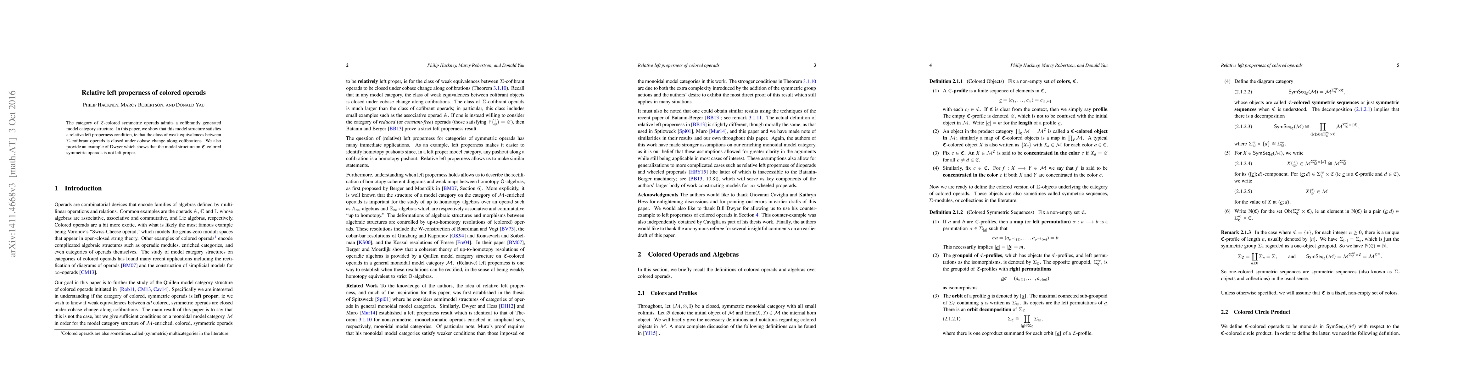 The category of $\mathfrak{C}$-colored symmetric operads admits a cofibrantly generated model category structure. In this paper, we show that this model structure satisfies a relative left properness condition, i.e., that the class of weak equivalences between $\Sigma$-cofibrant operads is closed under cobase change along cofibrations. We also provide an example of Dwyer which shows that the model structure on $\mathfrak{C}$-colored symmetric operads is not left proper.