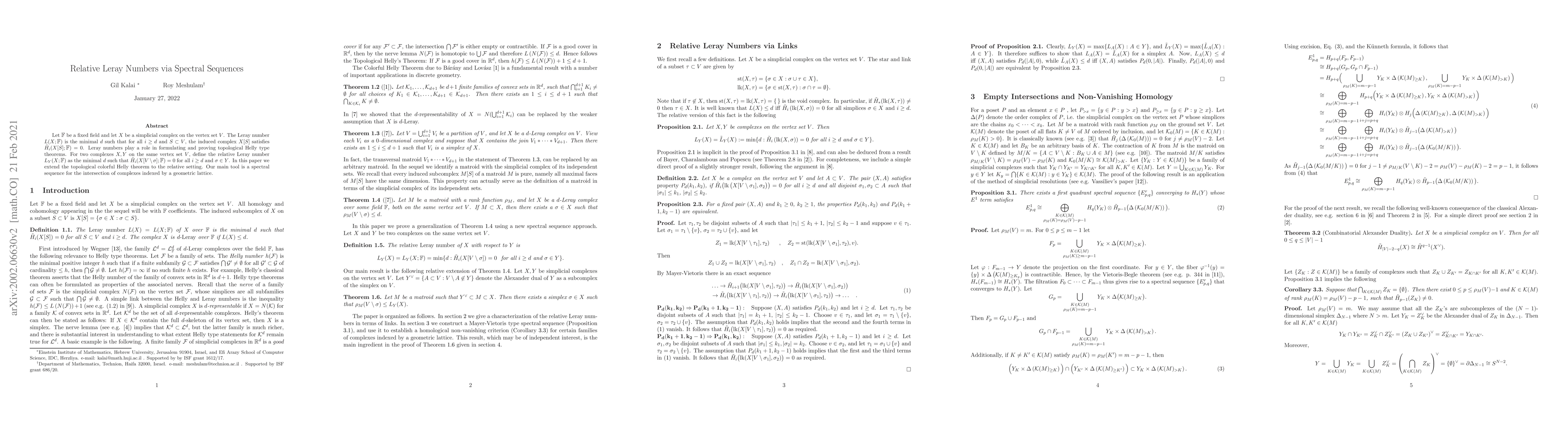Let $\mathbb{F}$ be a fixed field and let $X$ be a simplicial complex on the vertex set $V$. The Leray number $L(X;\mathbb{F})$ is the minimal $d$ such that for all $i \geq d$ and $S \subset V$, the induced complex $X[S]$ satisfies $\tilde{H}_i(X[S];\mathbb{F})=0$. Leray numbers play a role in formulating and proving topological Helly type theorems. For two complexes $X,Y$ on the same vertex set $V$, define the relative Leray number $L_Y(X;\mathbb{F})$ as the minimal $d$ such that $\tilde{H}_i(X[V \setminus \sigma];\mathbb{F})=0$ for all $i \geq d$ and $\sigma \in Y$. In this paper we extend the topological colorful Helly theorem to the relative setting. Our main tool is a spectral sequence for the intersection of complexes indexed by a geometric lattice.