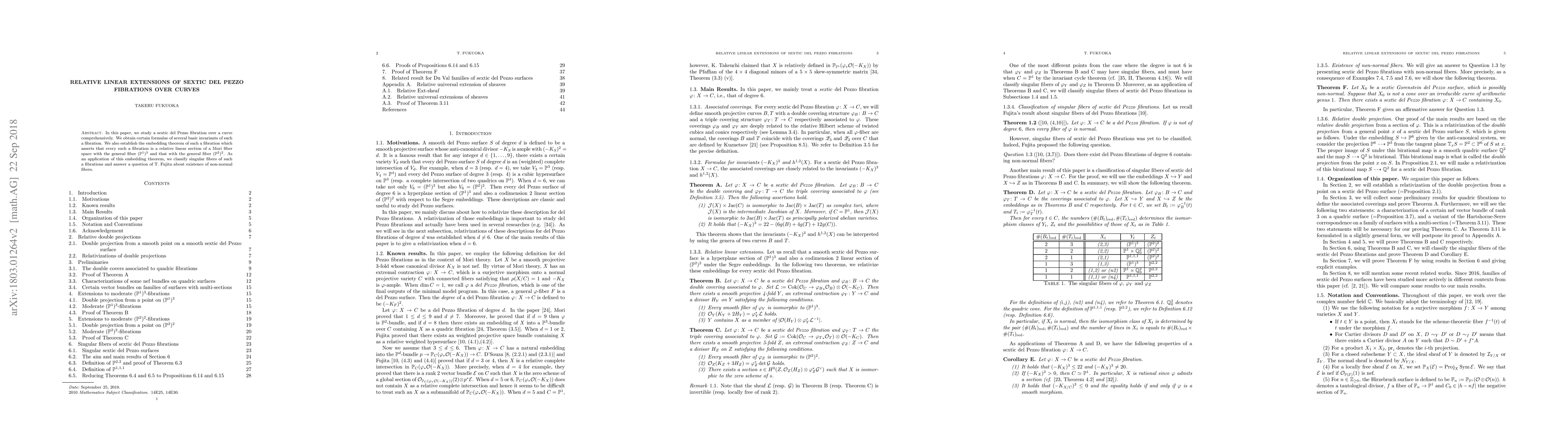 In this paper, we study a sextic del Pezzo fibration over a curve comprehensively. We obtain certain formulae of several basic invariants of such a fibration. We also establish the embedding theorem of such a fibration which asserts that every such a fibration is a relative linear section of a Mori fiber space with the general fiber $(\mathbb{P}^{1})^{3}$ and that with the general fiber $(\mathbb{P}^{2})^{2}$. As an application of this embedding theorem, we classify singular fibers of such a fibrations and answer a question of T. Fujita about existence of non-normal fibers.