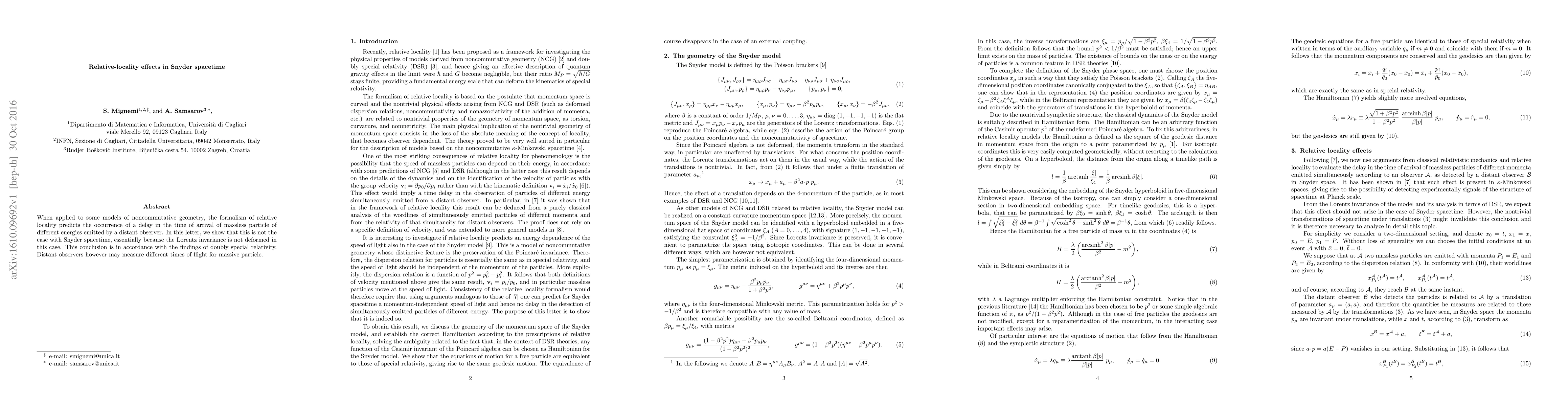 This paper explores relative-locality effects in Snyder spacetime and finds that, unlike some models of noncommutative geometry, it does not predict a time delay for massless particles. However, it does suggest that massive particles may experience different flight times as measured by distant observers.