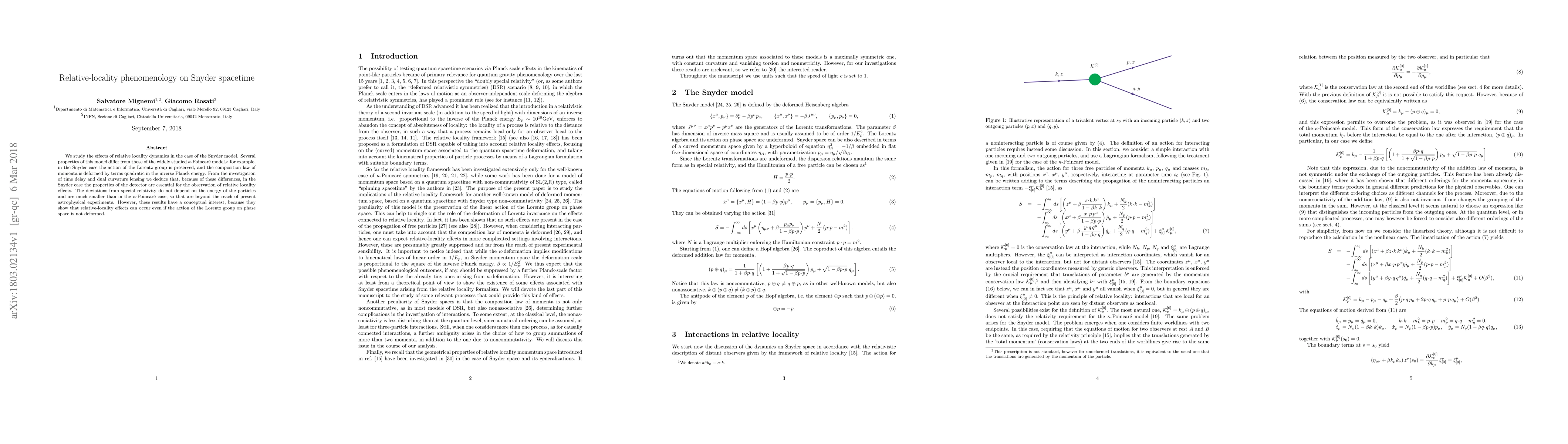 This paper investigates the phenomenology of relative locality in the Snyder model, where the Lorentz group action is preserved but momentum composition is deformed. It finds that relative locality effects depend critically on detector properties and are too small for current experiments to detect, despite being conceptually significant.