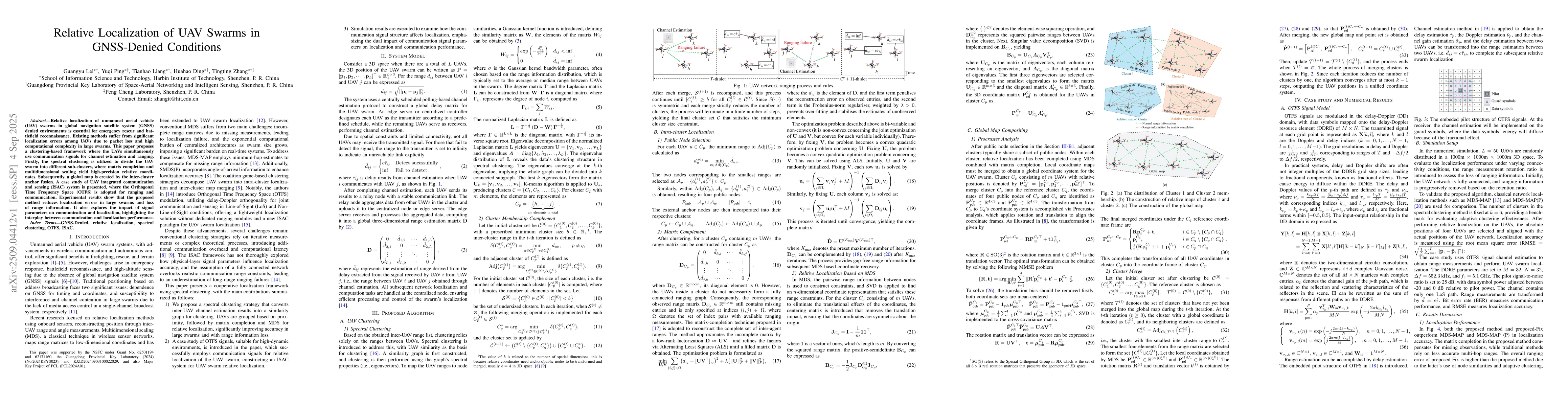 Relative localization of unmanned aerial vehicle (UAV) swarms in global navigation satellite system (GNSS) denied environments is essential for emergency rescue and battlefield reconnaissance. Existing methods suffer from significant localization errors among UAVs due to packet loss and high computational complexity in large swarms. This paper proposes a clustering-based framework where the UAVs simultaneously use communication signals for channel estimation and ranging. Firstly, the spectral clustering is utilized to divide the UAV swarm into different sub-clusters, where matrix completion and multidimensional scaling yield high-precision relative coordinates. Subsequently, a global map is created by the inter-cluster anchor fusion. A case study of UAV integrated communication and sensing (ISAC) system is presented, where the Orthogonal Time Frequency Space (OTFS) is adopted for ranging and communication. Experimental results show that the proposed method reduces localization errors in large swarms and loss of range information. It also explores the impact of signal parameters on communication and localization, highlighting the interplay between communication and localization performance.