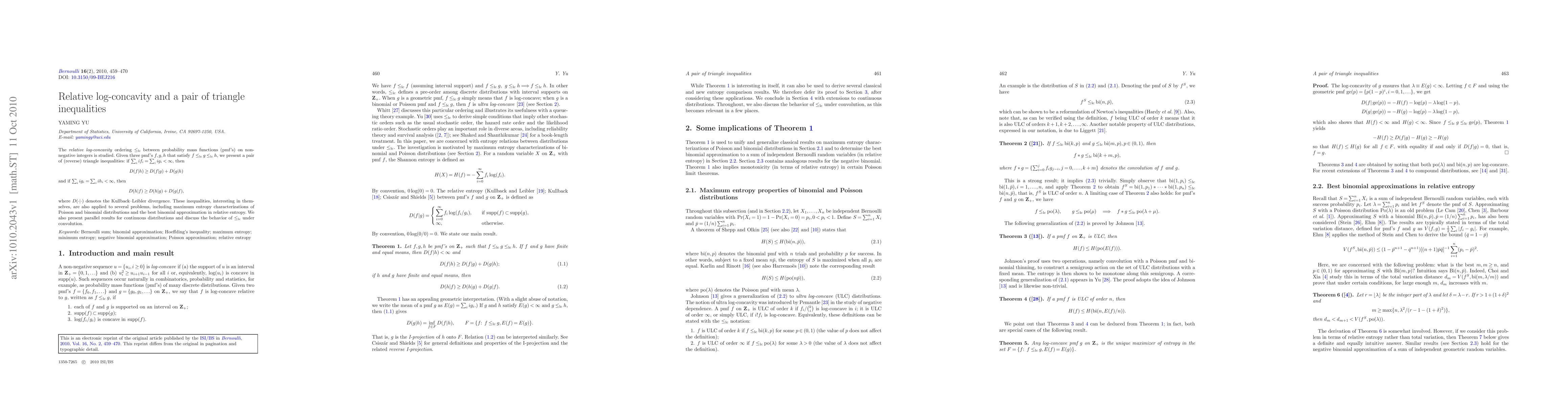 The relative log-concavity ordering $\leq_{\mathrm{lc}}$ between probability mass functions (pmf's) on non-negative integers is studied. Given three pmf's $f,g,h$ that satisfy $f\leq_{\mathrm{lc}}g\leq_{\mathrm{lc}}h$, we present a pair of (reverse) triangle inequalities: if $\sum_iif_i=\sum_iig_i<\infty,$ then \[D(f|h)\geq D(f|g)+D(g|h)\] and if $\sum_iig_i=\sum_iih_i<\infty,$ then \[D(h|f)\geq D(h|g)+D(g|f),\] where $D(\cdot|\cdot)$ denotes the Kullback--Leibler divergence. These inequalities, interesting in themselves, are also applied to several problems, including maximum entropy characterizations of Poisson and binomial distributions and the best binomial approximation in relative entropy. We also present parallel results for continuous distributions and discuss the behavior of $\leq_{\mathrm{lc}}$ under convolution.