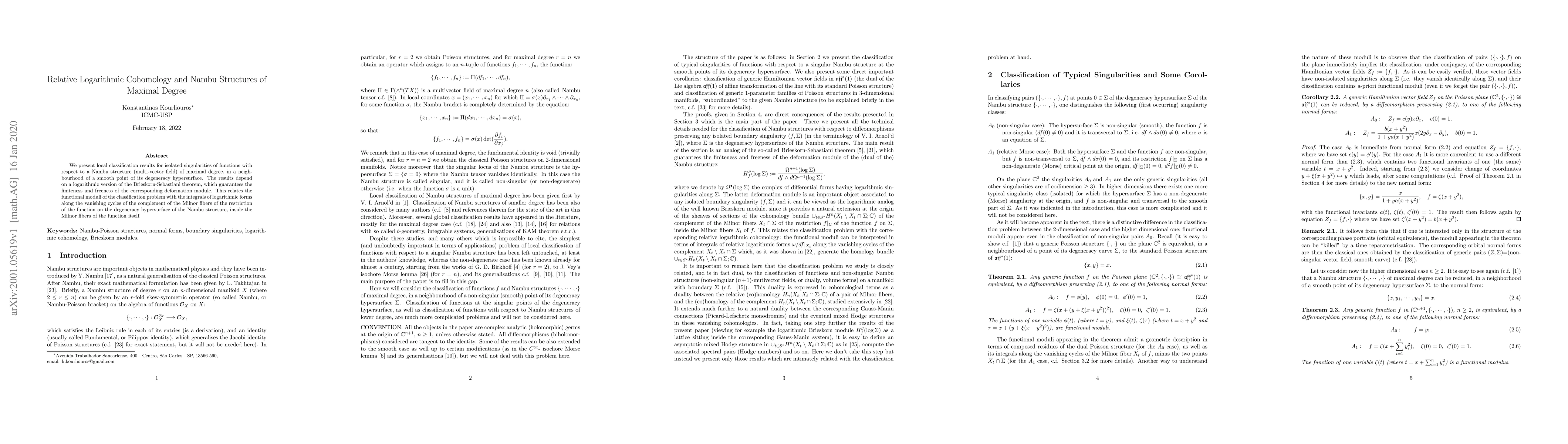 We present local classification results for isolated singularities of functions with respect to a Nambu structure (multi-vector field) of maximal degree, in a neighbourhood of a smooth point of its degeneracy hypersurface. The results depend on a logarithmic version of the Brieskorn-Sebastiani theorem, which guarantees the finiteness and freeness of the corresponding deformation module. This relates the functional moduli of the classification problem with the integrals of logarithmic forms along the vanishing cycles of the complement of the Milnor fibers of the restriction of the function on the degeneracy hypersurface of the Nambu structure, inside the Milnor fibers of the function itself.