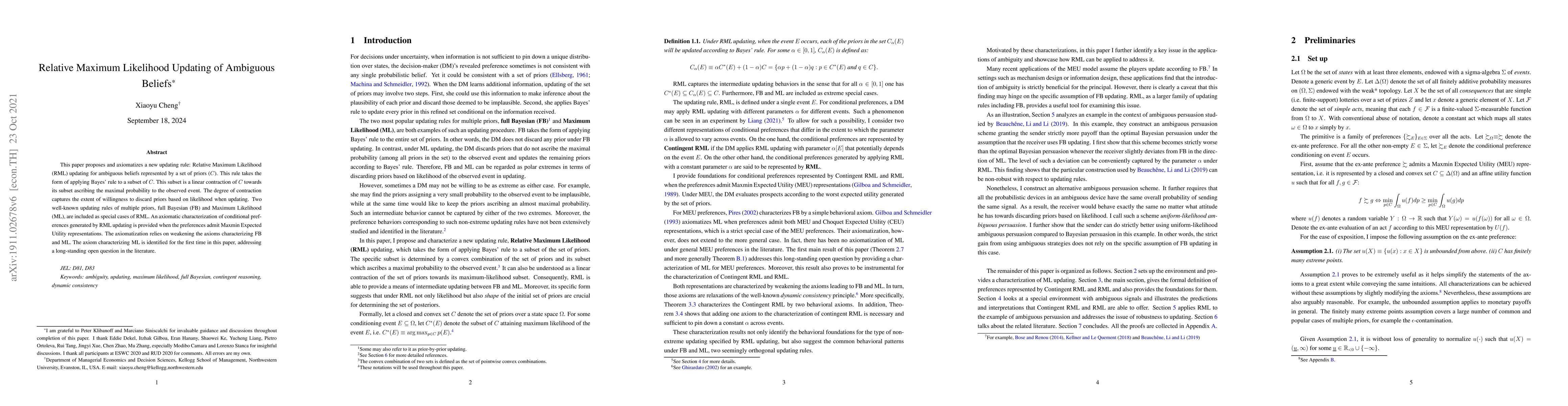 The identification of the axiom characterizing Maximum Likelihood updating within the framework of Relative Maximum Likelihood, along with its axiomatic characterization, represents a novel contribution to the literature on decision theory under ambiguity.