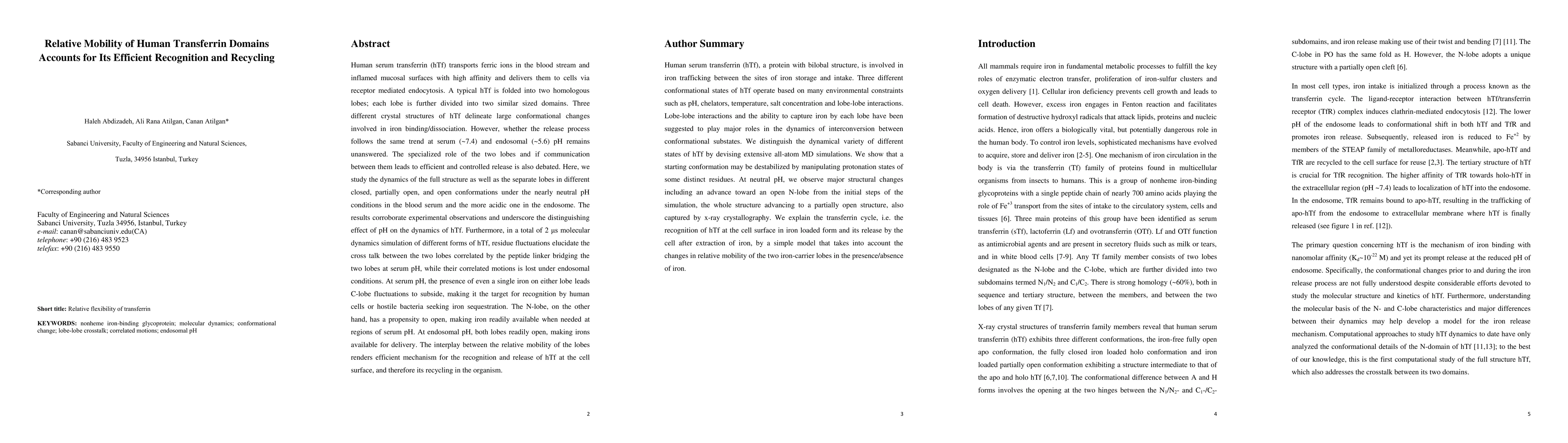 Human serum transferrin (hTf) transports ferric ions in the blood stream and inflamed mucosal surfaces with high affinity and delivers them to cells via receptor mediated endocytosis. A typical hTf is folded into two homologous lobes; each lobe is further divided into two similar sized domains. Three different crystal structures of hTf delineate large conformational changes involved in iron binding/dissociation. However, whether the release process follows the same trend at serum (~7.4) and endosomal (~5.6) pH remains unanswered. The specialized role of the two lobes and if communication between them leads to efficient and controlled release is also debated. Here, we study the dynamics of the full structure as well as the separate lobes in different closed, partially open, and open conformations under the nearly neutral pH conditions in the blood serum and the more acidic one in the endosome. The results corroborate experimental observations and underscore the distinguishing effect of pH on the dynamics of hTf. Furthermore, in a total of 2 {\mu}s molecular dynamics simulation of different forms of hTf, residue fluctuations elucidate the cross talk between the two lobes correlated by the peptide linker bridging the two lobes at serum pH, while their correlated motions is lost under endosomal conditions. At serum pH, the presence of even a single iron on either lobe leads C-lobe fluctuations to subside, making it the target for recognition by human cells or hostile bacteria seeking iron sequestration. The N-lobe, on the other hand, has a propensity to open, making iron readily available when needed at regions of serum pH. At endosomal pH, both lobes readily open, making irons available for delivery. The interplay between the relative mobility of the lobes renders efficient mechanism for the recognition and release of hTf at the cell surface, and therefore its recycling in the organism.