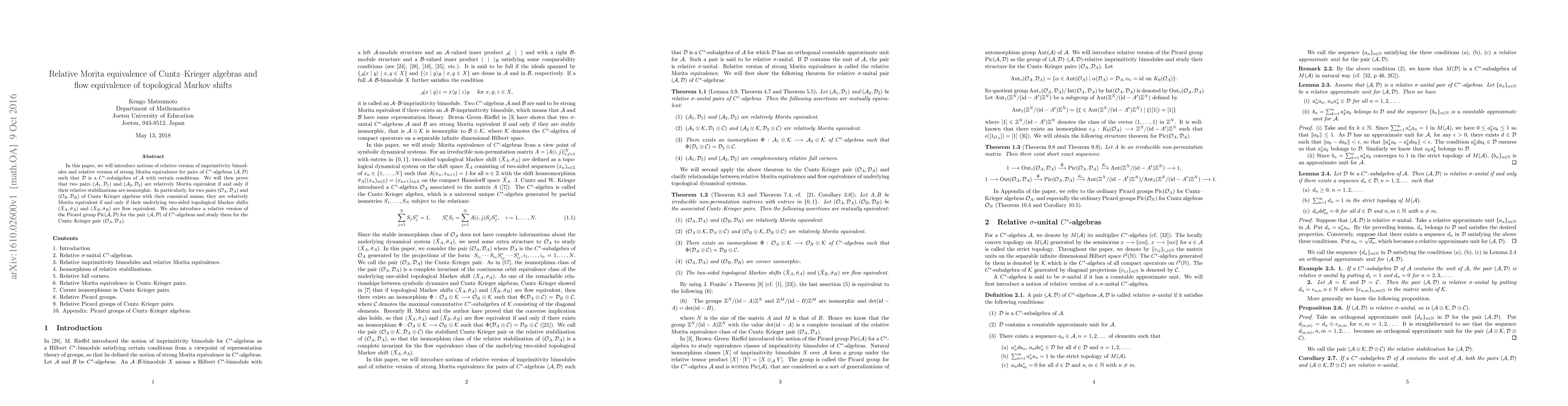 In this paper, we will introduce notions of relative version of imprimitivity bimodules and relative version of strong Morita equivalence for pairs of $C^*$-algebras $(\mathcal{A}, \mathcal{D})$ such that $\mathcal{D}$ is a $C^*$-subalgebra of $\mathcal{A}$ with certain conditions. We will then prove that two pairs $(\mathcal{A}_1, \mathcal{D}_1)$ and $(\mathcal{A}_2, \mathcal{D}_2)$ are relatively Morita equivalent if and only if their relative stabilizations are isomorphic. In particularly, for two pairs $(\mathcal{O}_A, \mathcal{D}_A)$ and $(\mathcal{O}_B, \mathcal{D}_B)$ of Cuntz--Krieger algebras with their canonical masas, they are relatively Morita equivalent if and only if their underlying two-sided topological Markov shifts $(\bar{X}_A,\bar{\sigma}_A)$ and $(\bar{X}_B,\bar{\sigma}_B)$ are flow equivalent. We also introduce a relative version of the Picard group ${\operatorname{Pic}}(\mathcal{A}, \mathcal{D})$ for the pair $(\mathcal{A}, \mathcal{D})$ of $C^*$-algebras and study them for the Cuntz--Krieger pair $(\mathcal{O}_A, \mathcal{D}_A)$.