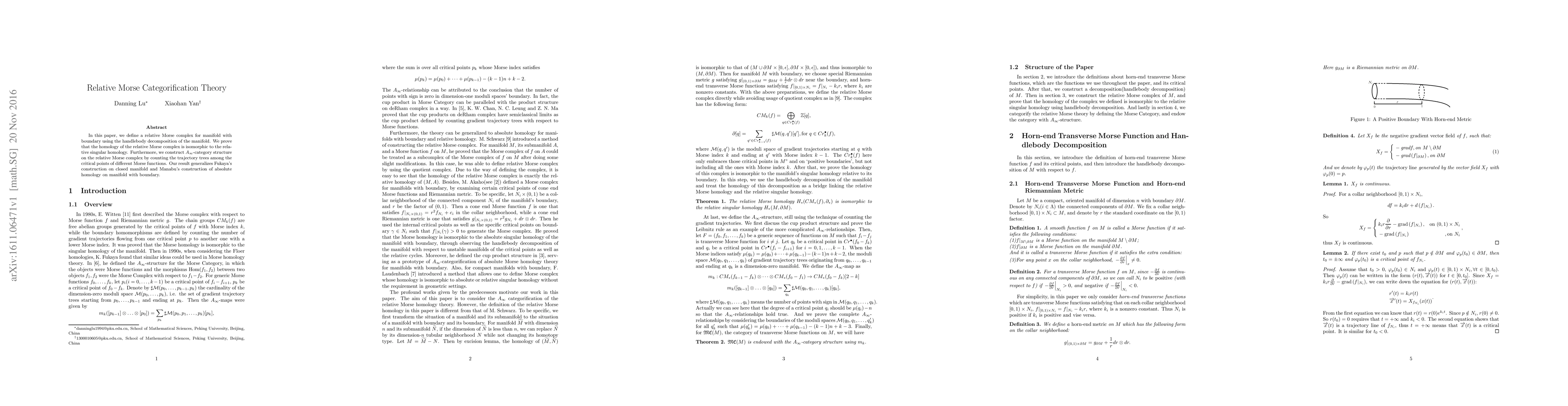 This paper introduces a relative Morse complex for manifolds with boundary via handlebody decomposition, proving its homology is isomorphic to relative singular homology. It also constructs an $A_\infty$-category structure on the complex by counting trajectory trees, generalizing previous constructions for closed manifolds and absolute homology.