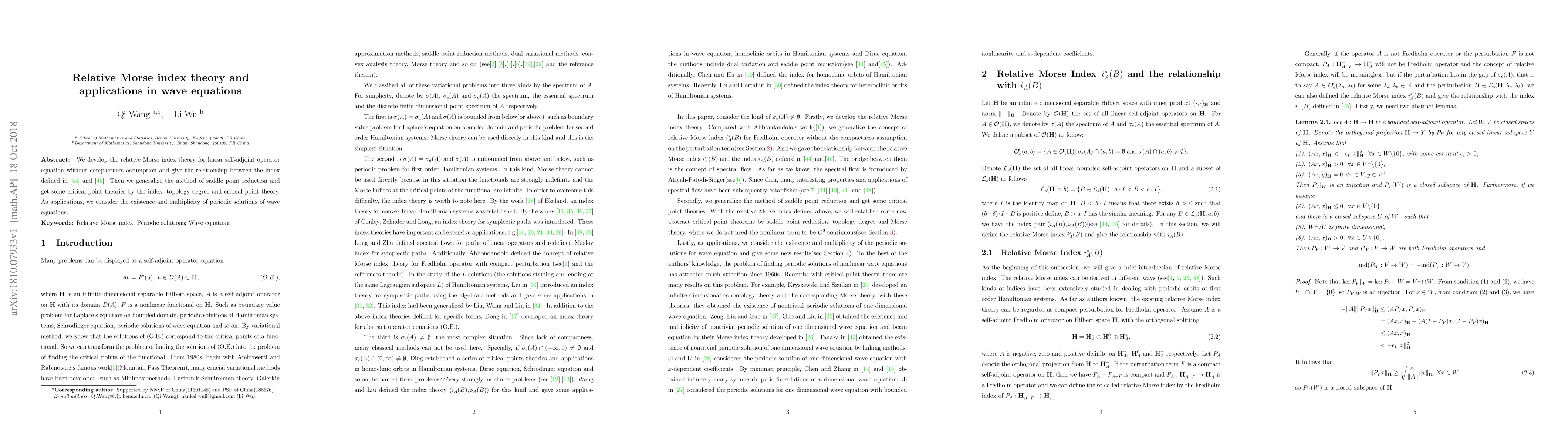 This paper develops relative Morse index theory for linear self-adjoint operator equations without compactness, linking different index definitions and applying it to derive critical point theories. It also explores the existence and multiplicity of periodic solutions in wave equations using these theories.