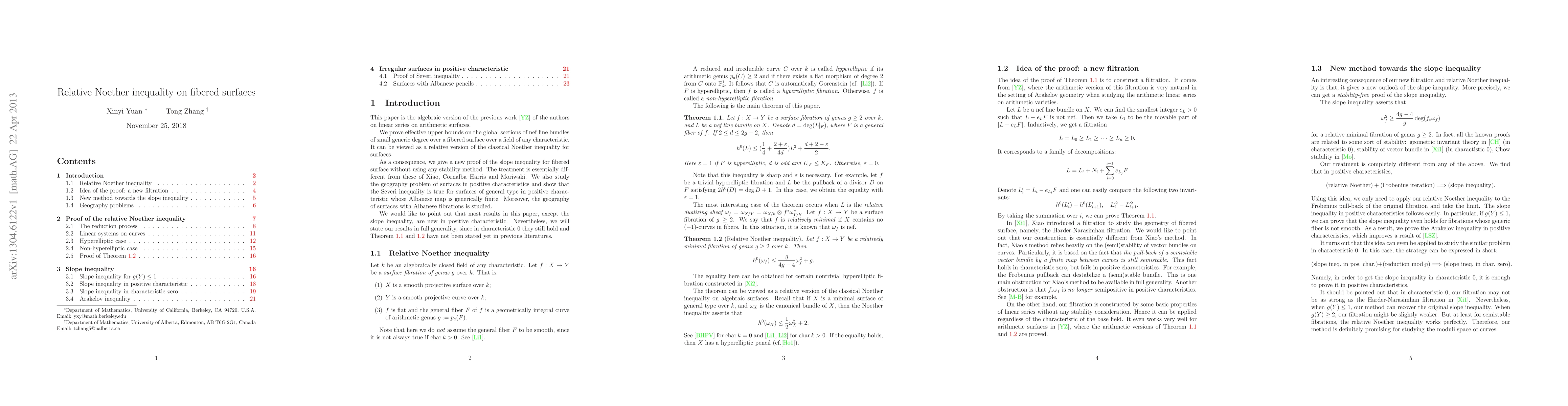 We prove effective upper bounds on the global sections of nef line bundles of small generic degree over a fibered surface over a field of any characteristic. It can be viewed as a relative version of the classical Noether inequality for surfaces. As a consequence, we give a new proof of the slope inequality for fibered surface without using any stability method. The treatment is essentially different from these of Xiao, Cornalba--Harris and Moriwaki. We also study the geography problem of surfaces in positive characteristics and show that the Severi inequality is true for surfaces of general type in positive characteristic whose Albanese map is generically finite. Moreover, the geography of surfaces with Albanese fibrations is studied.