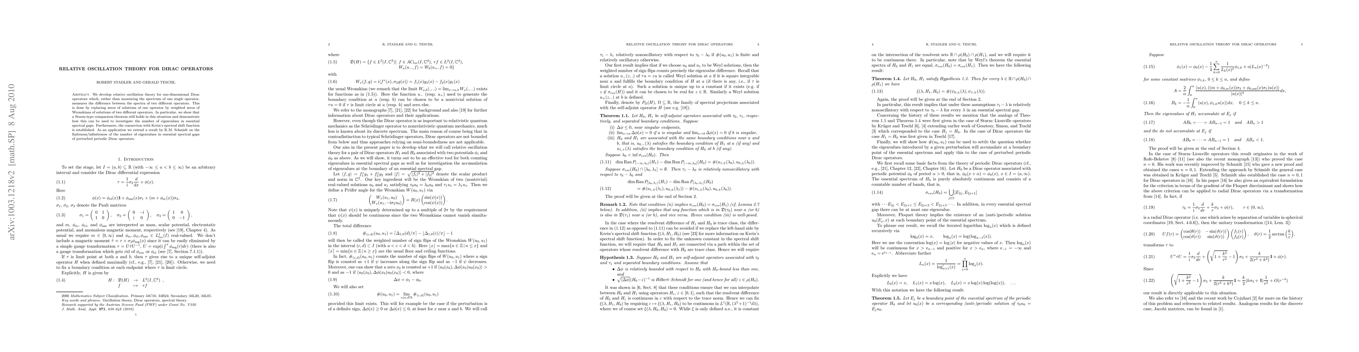 This paper develops relative oscillation theory for one-dimensional Dirac operators, focusing on the difference between the spectra of two operators rather than a single one. It establishes a Sturm-type comparison theorem for this context and connects it to Krein's spectral shift function, extending results on the number of eigenvalues in essential spectral gaps.