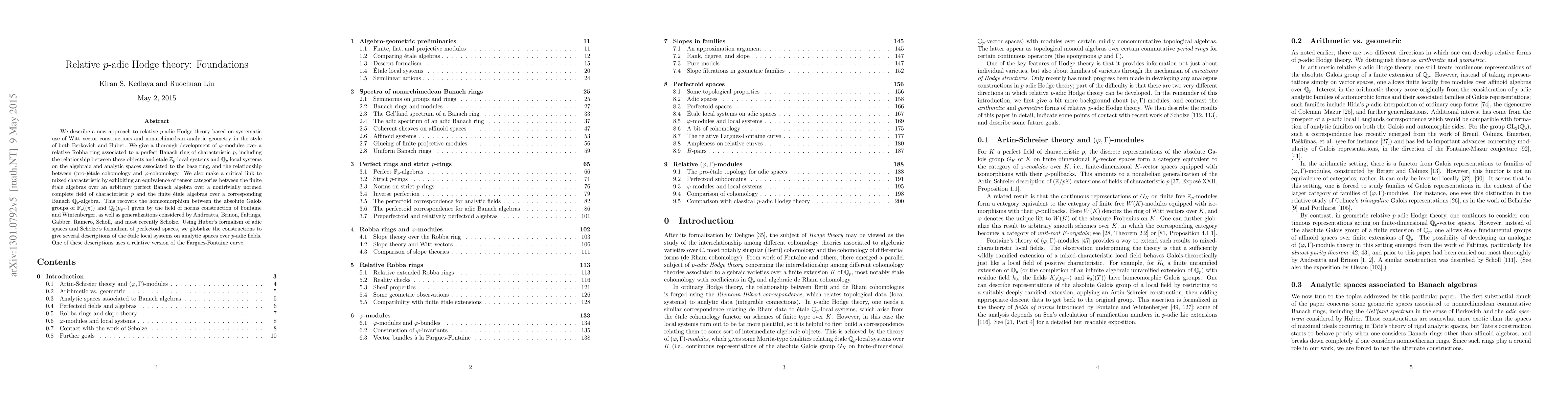 We describe a new approach to relative p-adic Hodge theory based on systematic use of Witt vector constructions and nonarchimedean analytic geometry in the style of both Berkovich and Huber. We give a thorough development of phi-modules over a relative Robba ring associated to a perfect Banach ring of characteristic p, including the relationship between these objects and etale Z_p-local systems and Q_p-local systems on the algebraic and analytic spaces associated to the base ring, and the relationship between etale cohomology and phi-cohomology. We also make a critical link to mixed characteristic by exhibiting an equivalence of tensor categories between the finite etale algebras over an arbitrary perfect Banach algebra over a nontrivially normed complete field of characteristic p and the finite etale algebras over a corresponding Banach Q_p-algebra. This recovers the homeomorphism between the absolute Galois groups of F_p((pi)) and Q_p(mu_{p^infty}) given by the field of norms construction of Fontaine and Wintenberger, as well as generalizations considered by Andreatta, Brinon, Faltings, Gabber, Ramero, Scholl, and most recently Scholze. Using Huber's formalism of adic spaces and Scholze's formalism of perfectoid spaces, we globalize the constructions to give several descriptions of the etale local systems on analytic spaces over p-adic fields. One of these descriptions uses a relative version of the Fargues-Fontaine curve.