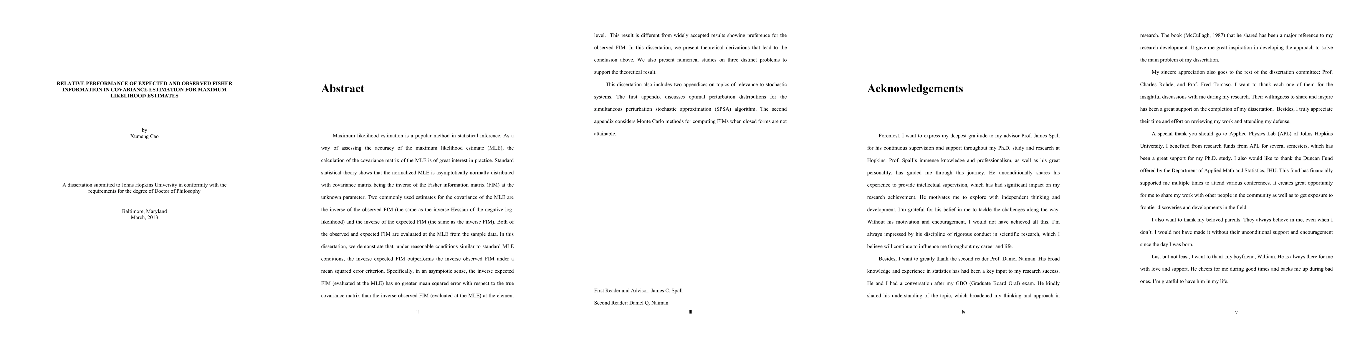 Maximum likelihood estimation is a popular method in statistical inference. As a way of assessing the accuracy of the maximum likelihood estimate (MLE), the calculation of the covariance matrix of the MLE is of great interest in practice. Standard statistical theory shows that the normalized MLE is asymptotically normally distributed with covariance matrix being the inverse of the Fisher information matrix (FIM) at the unknown parameter. Two commonly used estimates for the covariance of the MLE are the inverse of the observed FIM (the same as the inverse Hessian of the negative log-likelihood) and the inverse of the expected FIM (the same as the inverse FIM). Both of the observed and expected FIM are evaluated at the MLE from the sample data. In this dissertation, we demonstrate that, under reasonable conditions similar to standard MLE conditions, the inverse expected FIM outperforms the inverse observed FIM under a mean squared error criterion. Specifically, in an asymptotic sense, the inverse expected FIM (evaluated at the MLE) has no greater mean squared error with respect to the true covariance matrix than the inverse observed FIM (evaluated at the MLE) at the element level. This result is different from widely accepted results showing preference for the observed FIM. In this dissertation, we present theoretical derivations that lead to the conclusion above. We also present numerical studies on three distinct problems to support the theoretical result. This dissertation also includes two appendices on topics of relevance to stochastic systems. The first appendix discusses optimal perturbation distributions for the simultaneous perturbation stochastic approximation (SPSA) algorithm. The second appendix considers Monte Carlo methods for computing FIMs when closed forms are not attainable.