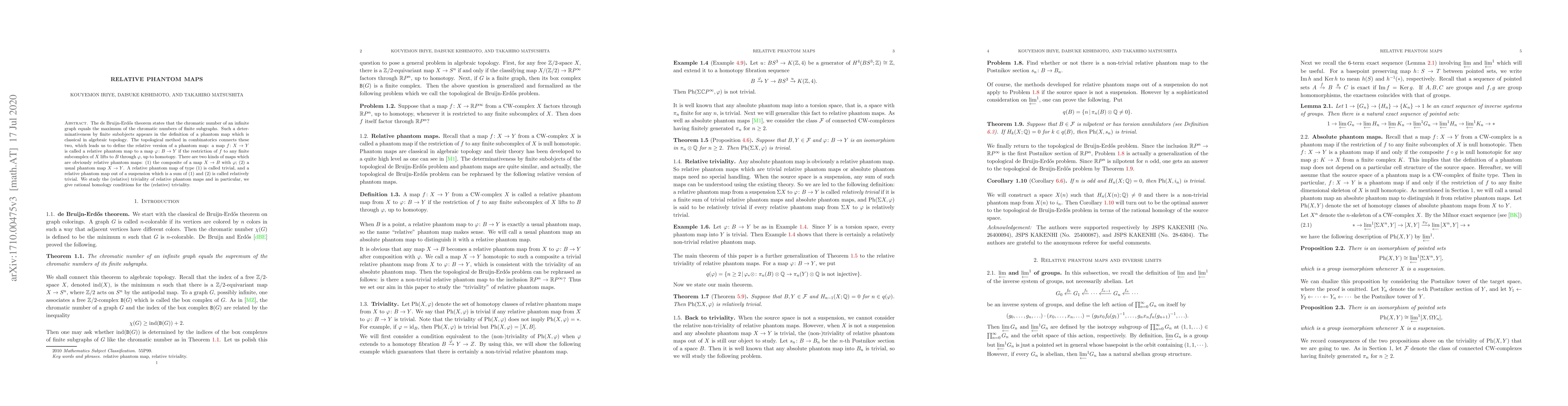 The de Bruijn-Erd\H{o}s theorem states that the chromatic number of an infinite graph equals the maximum of the chromatic numbers of finite subgraphs. Such a determinativeness by finite subobjects appears in the definition of a phantom map which is classical in algebraic topology. The topological method in combinatorics connects these two, which leads us to define the relative version of a phantom map: a map $f\colon X\to Y$ is called a relative phantom map to a map $\varphi\colon B\to Y$ if the restriction of $f$ to any finite subcomplex of $X$ lifts to $B$ through $\varphi$, up to homotopy. There are two kinds of maps which are obviously relative phantom maps: (1) the composite of a map $X\to B$ with $\varphi$; (2) a usual phantom map $X\to Y$. A relative phantom map of type (1) is called trivial, and a relative phantom map out of a suspension which is a sum of (1) and (2) is called relatively trivial. We study the (relative) triviality of relative phantom maps and in particular, we give rational homology conditions for the (relative) triviality.
