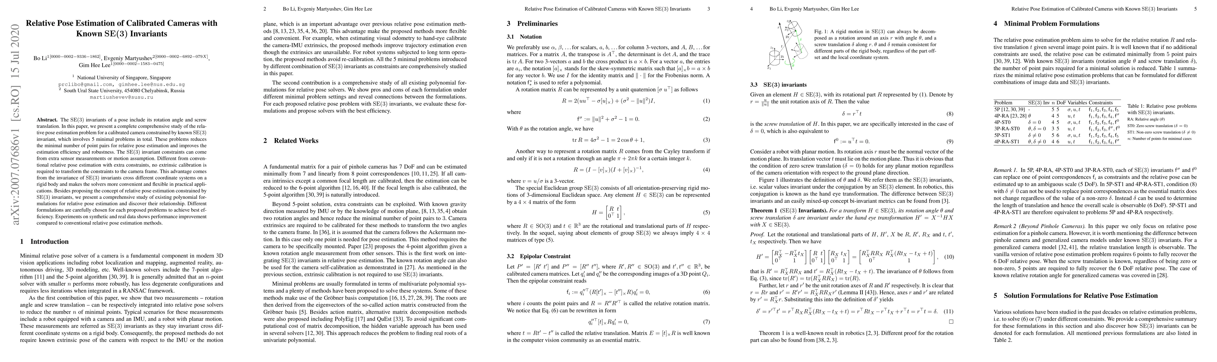 The paper presents a comprehensive study on relative pose estimation for calibrated cameras constrained by known SE(3) invariants, reducing the minimal number of point pairs and improving estimation efficiency and robustness. It introduces the concept of relative pose estimation with SE(3) invariant constraints, which eliminates the need for extrinsic calibration due to the invariance of SE(3) invariants across different coordinate systems on a rigid body.