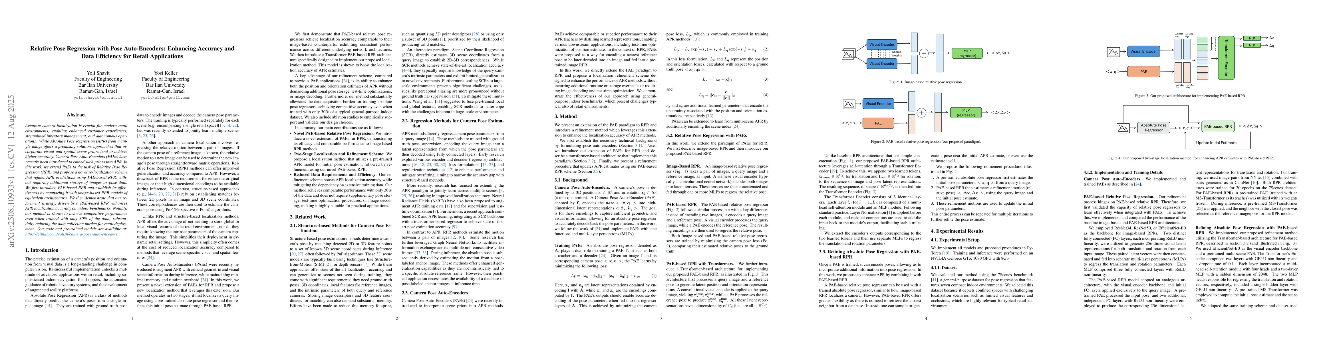 Accurate camera localization is crucial for modern retail environments, enabling enhanced customer experiences, streamlined inventory management, and autonomous operations. While Absolute Pose Regression (APR) from a single image offers a promising solution, approaches that incorporate visual and spatial scene priors tend to achieve higher accuracy. Camera Pose Auto-Encoders (PAEs) have recently been introduced to embed such priors into APR. In this work, we extend PAEs to the task of Relative Pose Regression (RPR) and propose a novel re-localization scheme that refines APR predictions using PAE-based RPR, without requiring additional storage of images or pose data. We first introduce PAE-based RPR and establish its effectiveness by comparing it with image-based RPR models of equivalent architectures. We then demonstrate that our refinement strategy, driven by a PAE-based RPR, enhances APR localization accuracy on indoor benchmarks. Notably, our method is shown to achieve competitive performance even when trained with only 30% of the data, substantially reducing the data collection burden for retail deployment. Our code and pre-trained models are available at: https://github.com/yolish/camera-pose-auto-encoders