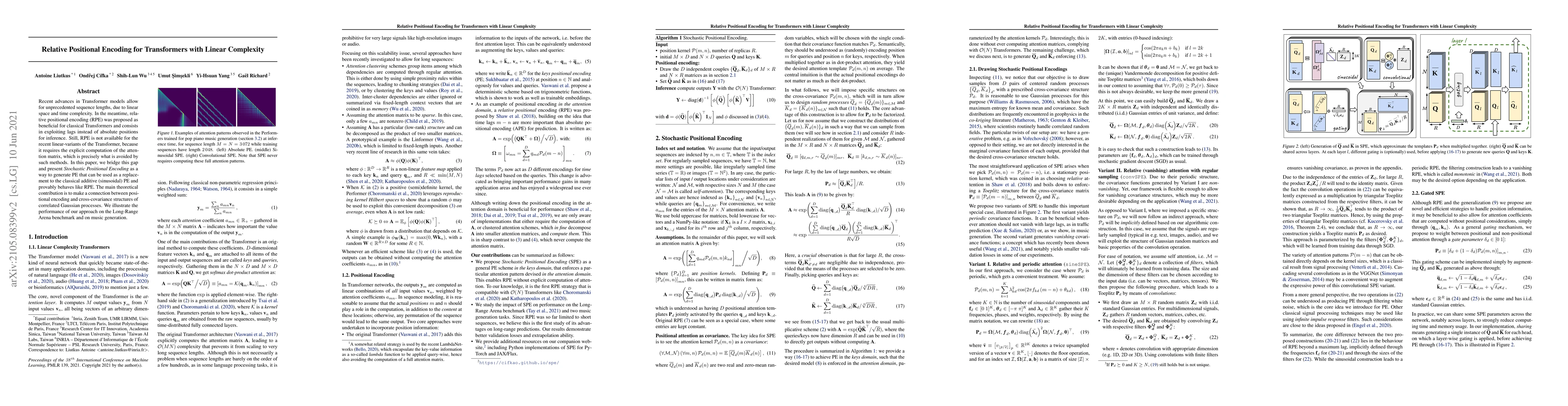 This paper introduces Stochastic Positional Encoding to incorporate relative positional information in linear-complexity Transformers, providing a substitute for classical sinusoidal positional encoding. It connects positional encoding to cross-covariance structures, demonstrating effectiveness on Long-Range Arena and music generation tasks.