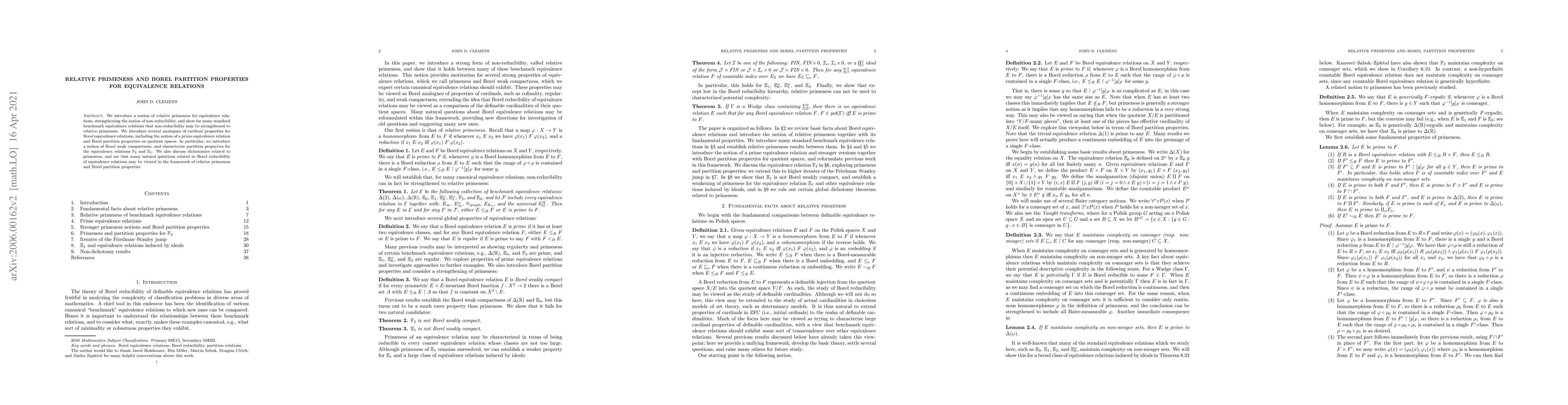 This paper introduces a strengthened notion of relative primeness for equivalence relations, showing that many standard equivalence relations exhibit this property. It also explores Borel partition properties, including prime equivalence relations and Borel weak compactness, and provides characterizations for specific equivalence relations.