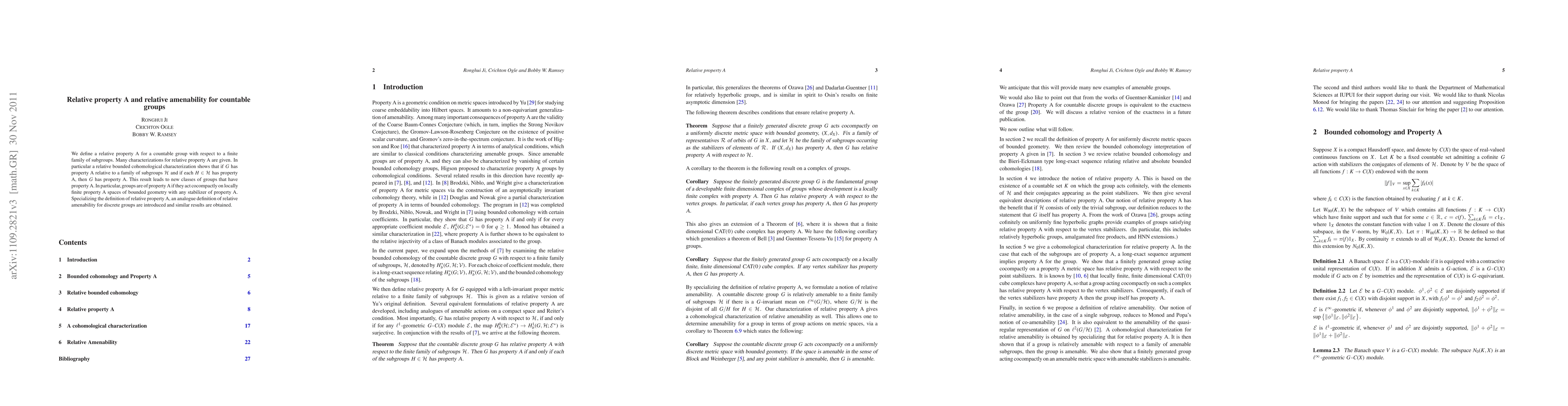We define a relative property A for a countable group with respect to a finite family of subgroups. Many characterizations for relative property A are given. In particular a relative bounded cohomological characterization shows that if a group has property A relative to a family of subgroups, each of which has property A, then the group has property A. This result leads to new classes of groups that have property A. In particular, groups are of property A if they act cocompactly on locally finite property A spaces of bounded geometry with at least one stabilizer of property A. Specializing the definition of relative property A, an analogue definition of relative amenability for discrete groups are introduced and similar results are obtained.