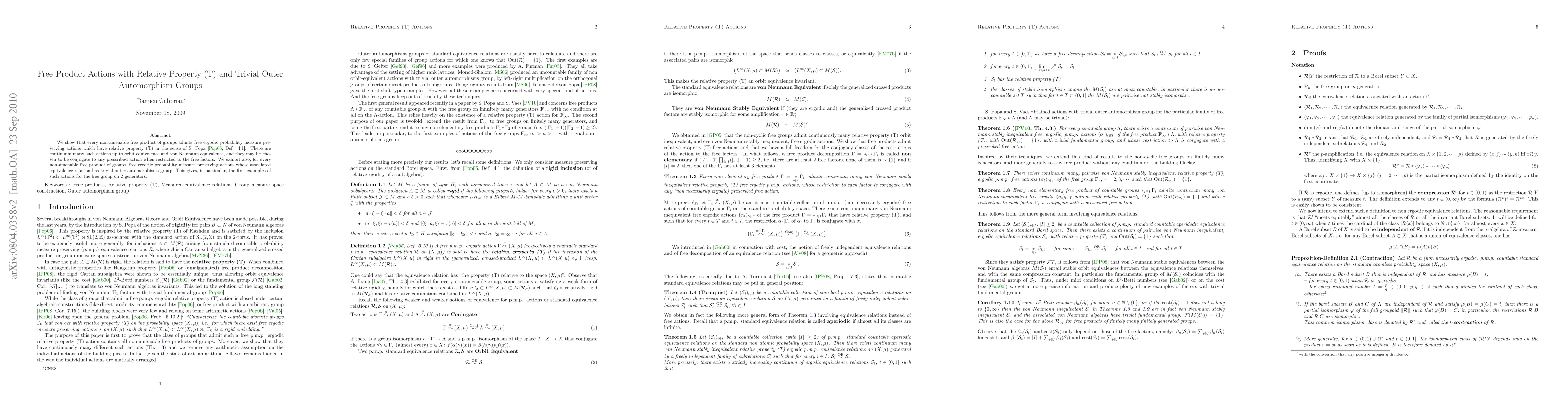 This paper demonstrates that non-amenable free products of groups possess free ergodic probability measure preserving actions with relative property (T), with uncountably many such actions up to equivalence. Additionally, it presents free ergodic actions with trivial outer automorphism groups, providing the first examples for the free group on two generators.