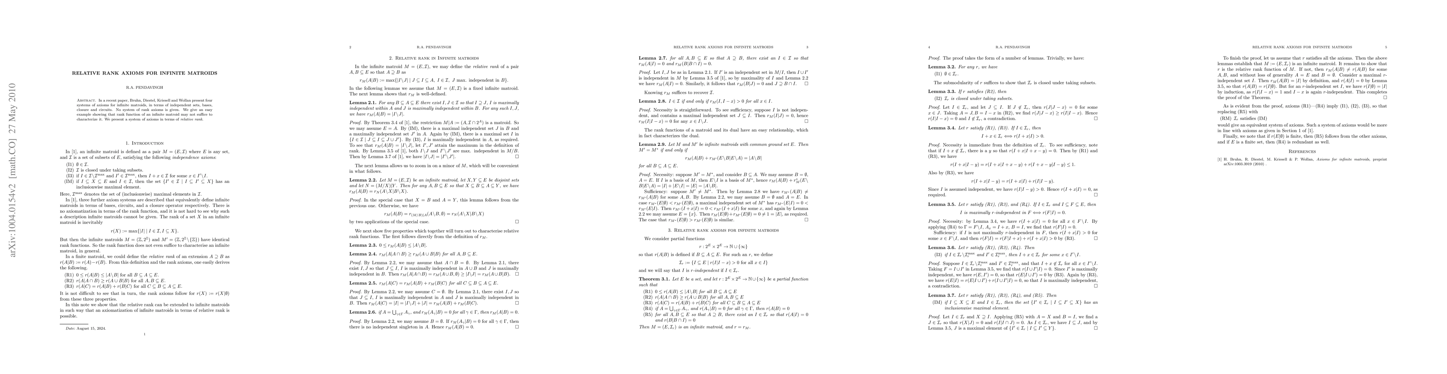 This paper introduces a system of relative rank axioms for infinite matroids, demonstrating that a rank function alone may not fully characterize them. It provides a counterexample and proposes a new framework based on relative rank to address this issue.