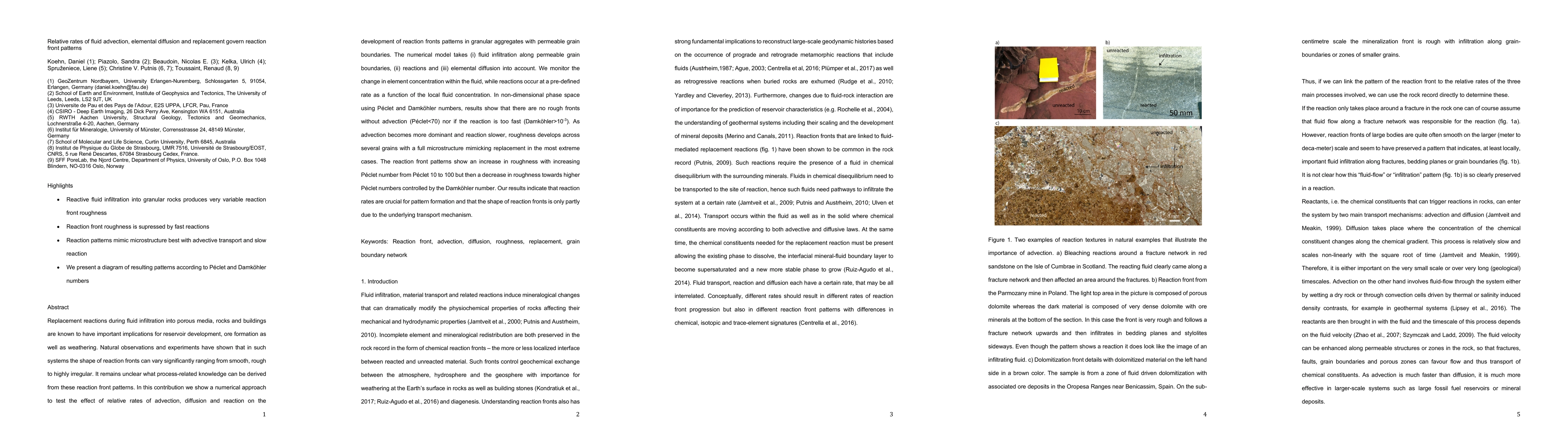 This paper uses a numerical model to investigate how the relative rates of fluid advection, elemental diffusion, and replacement reactions influence the patterns of reaction fronts in porous media. The study finds that reaction front roughness is governed by the interplay between advection dominance and reaction rates, with significant implications for understanding processes like reservoir development and weathering.