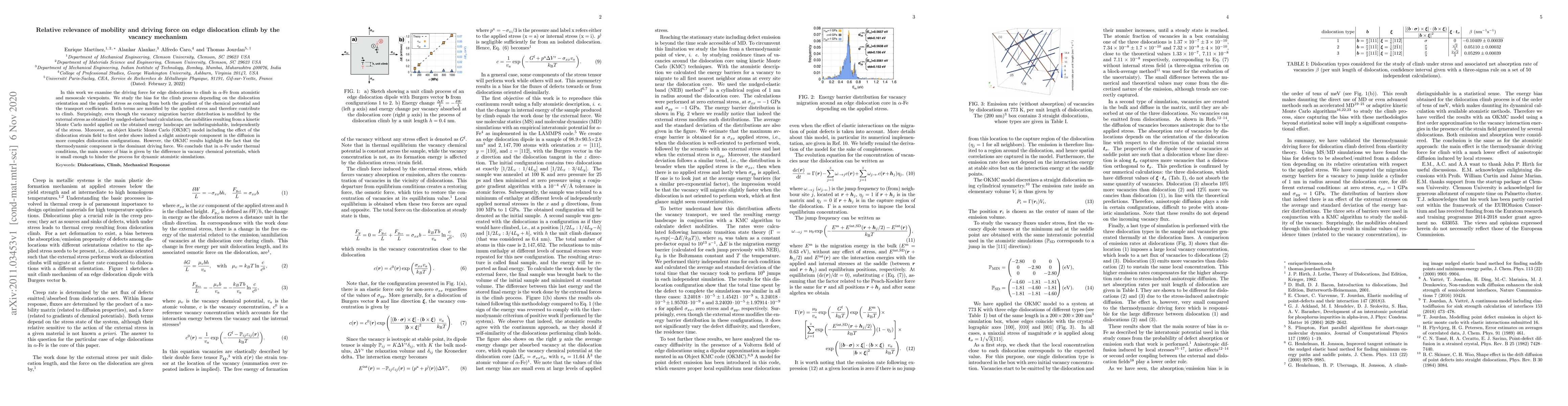 This study investigates the driving forces for edge dislocation climb in $\alpha$-Fe, finding that the thermodynamic component, specifically the difference in vacancy chemical potentials, is the dominant factor, while dislocation mobility remains nearly constant under varying stress conditions. The research highlights the minor role of anisotropic diffusion in complex dislocation configurations.