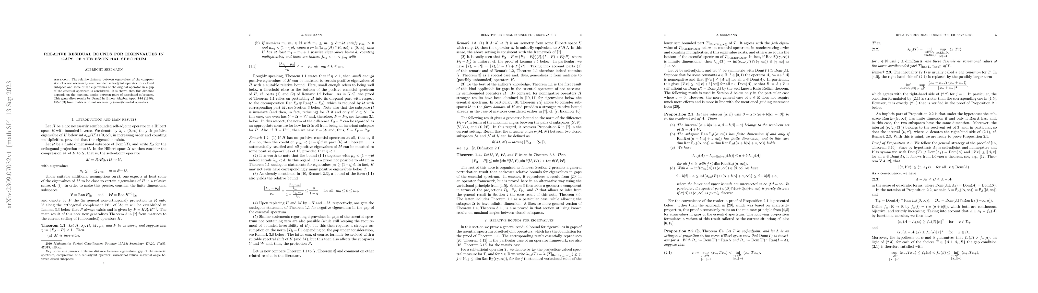 This paper investigates the relative residual bounds for eigenvalues between a self-adjoint operator's compression and its original eigenvalues in essential spectrum gaps. It generalizes Drma\v{c}'s earlier results from matrices to broader operator classes, showing that the distance depends on the maximal angles between associated subspaces.