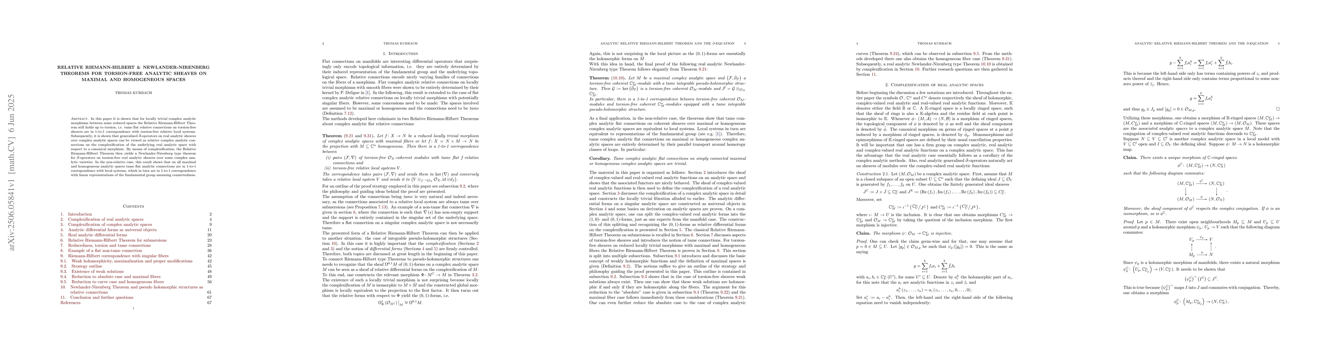 The paper establishes connections between Riemann-Hilbert and Newlander-Nirenberg theorems for torsion-free analytic sheaves on maximal and homogeneous spaces, providing 1-to-1 correspondences between tame flat connections and local systems.