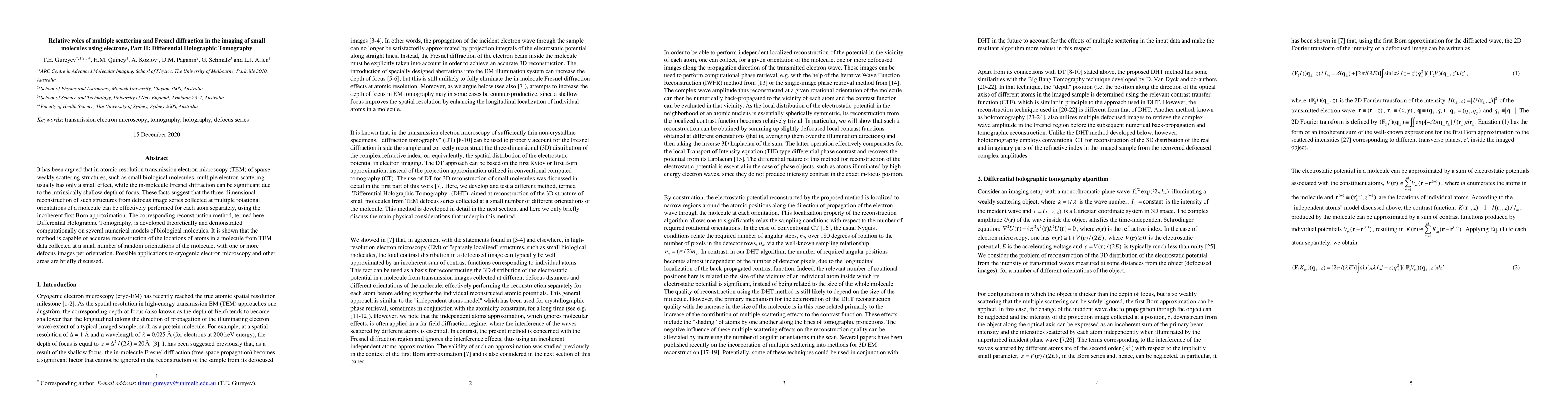 This paper explores the use of Differential Holographic Tomography for reconstructing three-dimensional structures of small biological molecules using electron microscopy, emphasizing the significance of Fresnel diffraction over multiple scattering. The method allows for accurate atom localization from limited TEM data, with potential applications in cryogenic electron microscopy.