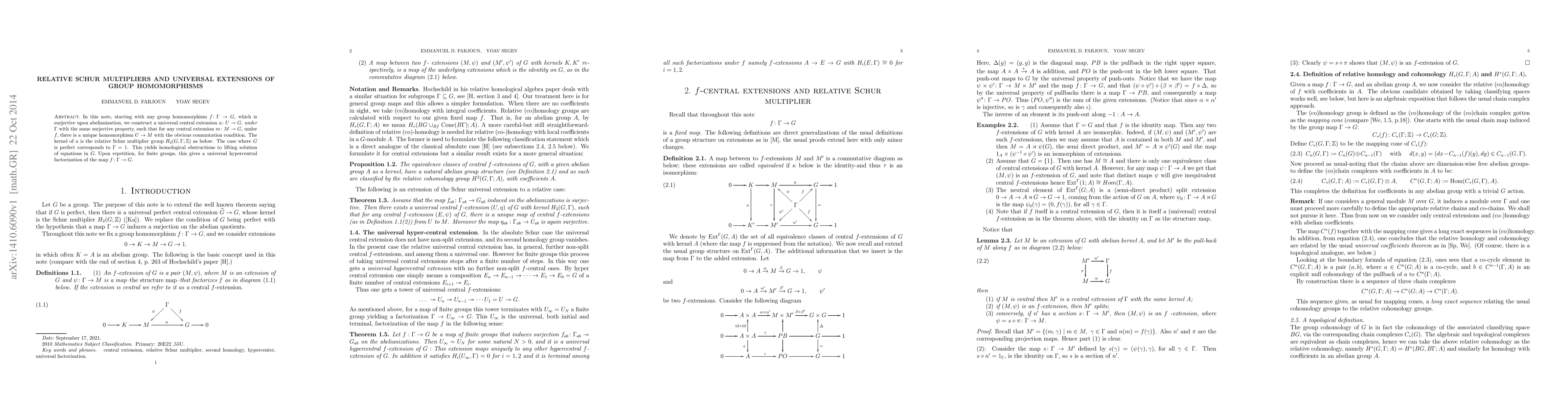 In this note, starting with any group homomorphism $f\colon\Gamma\to G$, which is surjective upon abelianization, we construct a universal central extension $u\colon U\twoheadrightarrow G,$ UNDER $\Gamma$ with the same surjective property, such that for any central extension $m\colon M\twoheadrightarrow G,$ under $f,$ there is a unique homomorphism $U\to M$ with the obvious commutation condition. The kernel of $u$ is the relative Schur multiplier group $H_2(G,\Gamma;\mathbb{Z})$ as defined in the paper. The case where $G$ is perfect corresponds to $\Gamma=1$. This yields homological obstructions to lifting solution of equations in $G.$ Upon repetition, for finite groups, this gives a universal hypercentral factorization of the map $f\colon\Gamma\to G$.