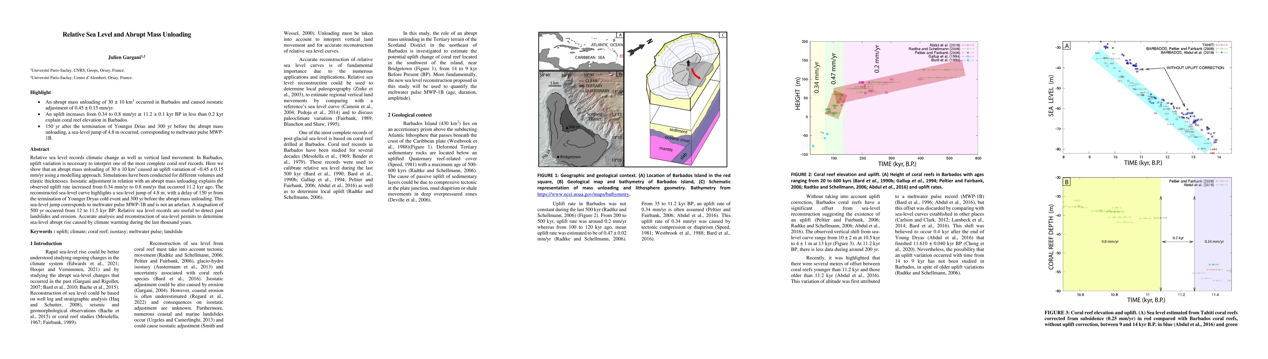 This study demonstrates that an abrupt mass unloading of 30 km3 in Barbados led to an uplift variation and an increase in the uplift rate from 0.34 mm/yr to 0.8 mm/yr, correlating with a significant sea-level jump of 4.8 m linked to meltwater pulse MWP-1B. Accurate sea-level reconstructions help identify past climatic events and abrupt rises.