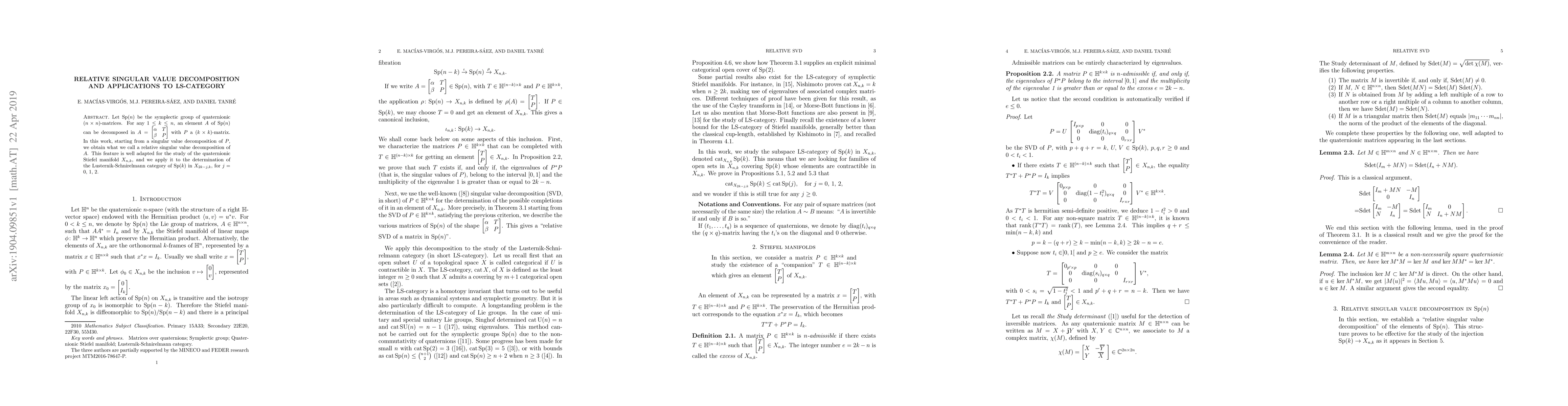 Let $Sp(n)$ be the symplectic group of quaternionic $(n\times n)$-matrices. For any $1\leq k\leq n$, an element $A$ of $Sp(n)$ can be decomposed in $A= \begin{bmatrix} \alpha&T\cr \beta&P \end{bmatrix}$ with $P$ a $(k\times k)$-matrix. In this work, starting from a singular value decomposition of $P$, we obtain what we call a relative singular value decomposition of $A$. This feature is well adapted for the study of the quaternionic Stiefel manifold $X_{n,k}$, and we apply it to the determination of the Lusternik-Schnirelmann category of $Sp(k)$ in $X_{2k-j,k}$, for $j= 0,\,1,\,2$
