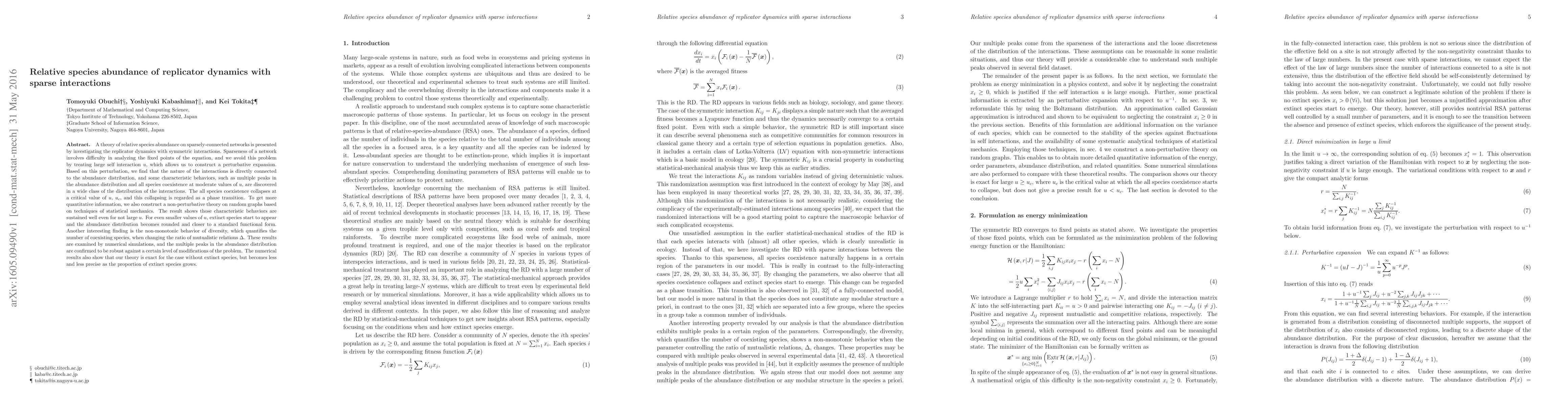 This paper develops a theory for relative species abundance on sparsely-connected networks using replicator dynamics with symmetric interactions. It finds that large self-interactions allow for a perturbative expansion, revealing multiple peaks in abundance distribution and all species coexistence at moderate self-interaction values, collapsing into a phase transition at a critical value.