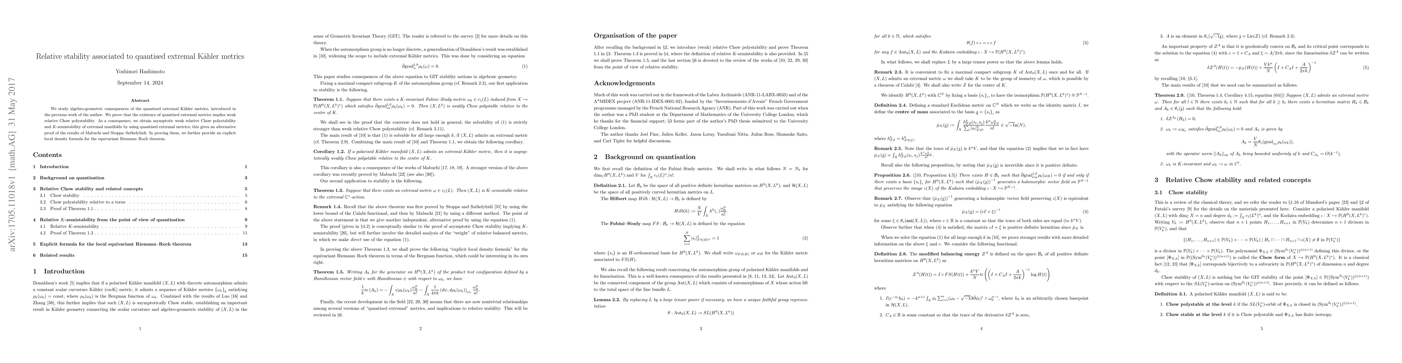 The paper establishes the algebro-geometric implications of quantised extremal Kähler metrics, proving their existence implies weak relative Chow polystability. It also provides an alternative proof for asymptotic weak relative Chow polystability and $K$-semistability of extremal manifolds, along with an explicit local density formula for the equivariant Riemann-Roch theorem.