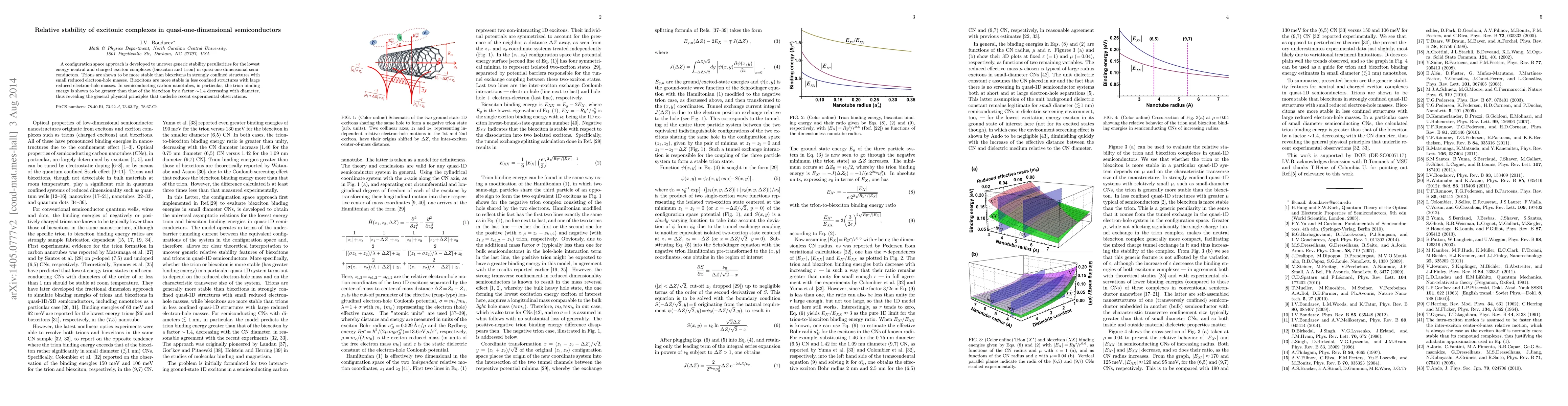This paper develops a configuration space approach to analyze the stability of excitonic complexes in quasi-one-dimensional semiconductors, finding that trions are more stable than biexcitons in strongly confined structures, while biexcitons dominate in less confined structures. In carbon nanotubes, trions exhibit a higher binding energy than biexcitons, explaining recent experimental observations.
