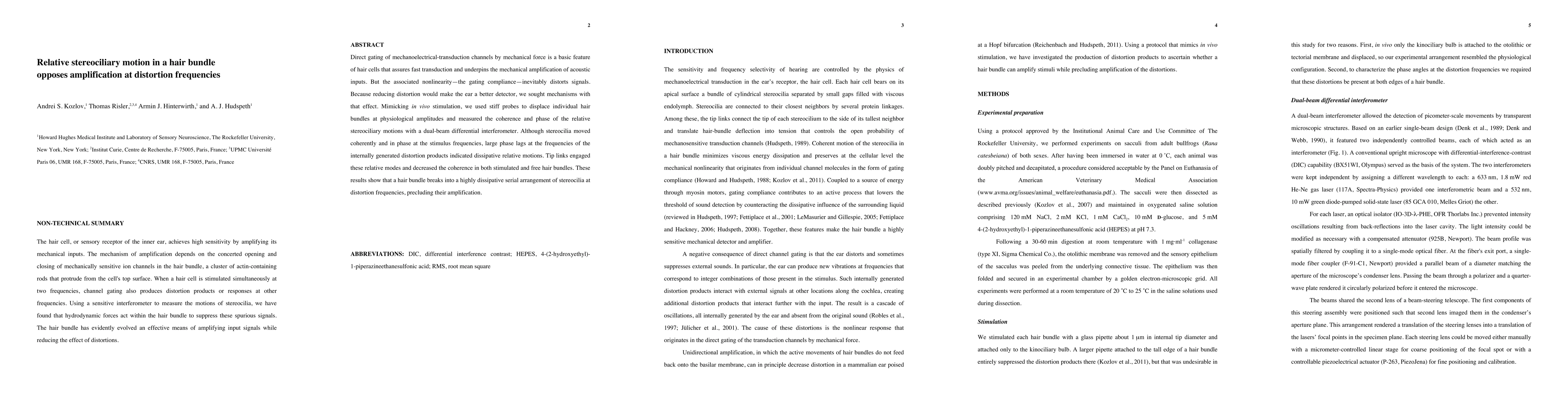 Direct gating of mechanoelectrical-transduction channels by mechanical force is a basic feature of hair cells that assures fast transduction and underpins the mechanical amplification of acoustic inputs. But the associated nonlinearity - the gating compliance - inevitably distorts signals. Because reducing distortion would make the ear a better detector, we sought mechanisms with that effect. Mimicking in vivo stimulation, we used stiff probes to displace individual hair bundles at physiological amplitudes and measured the coherence and phase of the relative stereociliary motions with a dual-beam differential interferometer. Although stereocilia moved coherently and in phase at the stimulus frequencies, large phase lags at the frequencies of the internally generated distortion products indicated dissipative relative motions. Tip links engaged these relative modes and decreased the coherence in both stimulated and free hair bundles. These results show that a hair bundle breaks into a highly dissipative serial arrangement of stereocilia at distortion frequencies, precluding their amplification.