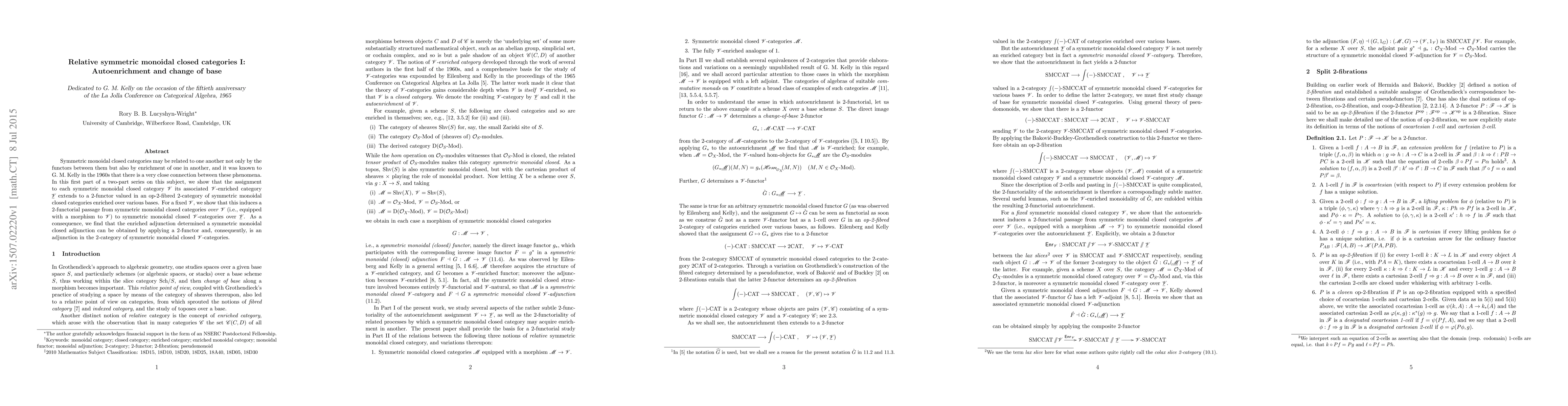Symmetric monoidal closed categories may be related to one another not only by the functors between them but also by enrichment of one in another, and it was known to G. M. Kelly in the 1960s that there is a very close connection between these phenomena. In this first part of a two-part series on this subject, we show that the assignment to each symmetric monoidal closed category $V$ its associated $V$-enriched category $\underline{V}$ extends to a 2-functor valued in an op-2-fibred 2-category of symmetric monoidal closed categories enriched over various bases. For a fixed $V$, we show that this induces a 2-functorial passage from symmetric monoidal closed categories $\textit{over}$ $V$ (i.e., equipped with a morphism to $V$) to symmetric monoidal closed $V$-categories over $\underline{V}$. As a consequence, we find that the enriched adjunction determined a symmetric monoidal closed adjunction can be obtained by applying a 2-functor and, consequently, is an adjunction in the 2-category of symmetric monoidal closed $V$-categories.