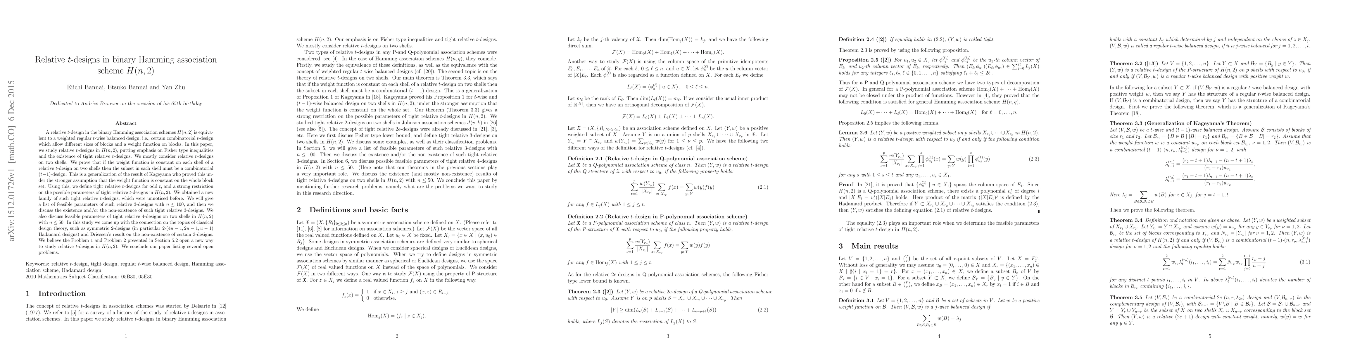 This paper explores relative t-designs within the binary Hamming association scheme H(n,2), focusing on Fisher type inequalities and tight relative t-designs, particularly on two shells. It establishes new results on the existence of combinatorial designs under constant weight functions and presents a new family of tight relative t-designs, along with feasible parameters for relative 3-designs up to n=100 and relative 4-designs up to n=50.